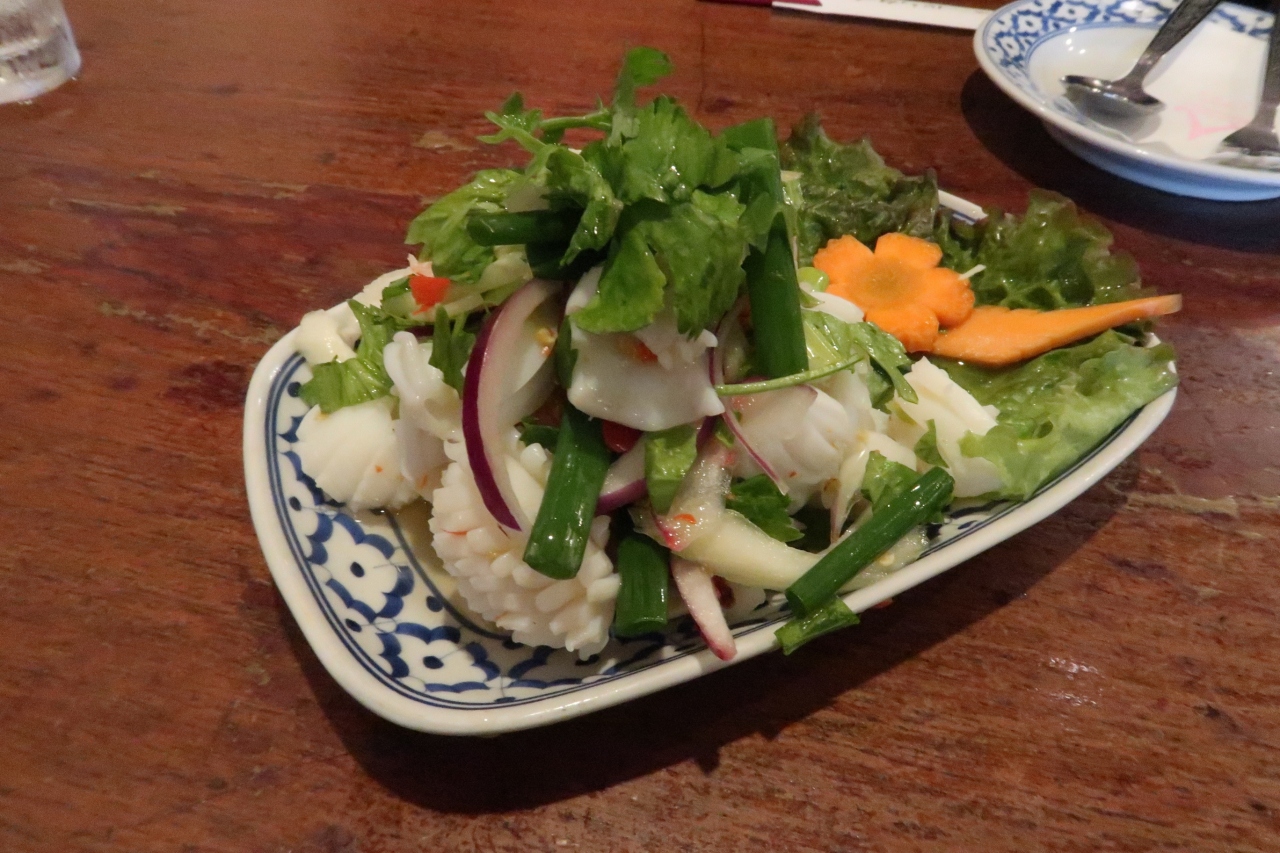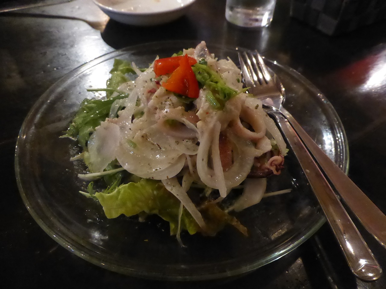 ●ヤムチャオタレー(海の幸入り辛口サラダ) 海の幸はイカ、ホタテ、エビですが7割以上イカ。プリプリした食感が楽しめます。辛口の方だと思いますが、酸味もあるので香味野菜と合わせるとちょうどいい。食べ応えがあります。