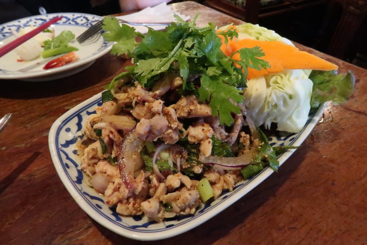 ●ラープガイ(鶏ひき肉と香辛料のサラダ) しっかり味なので間にキャベツを挟んで食べ進みます。ひき肉というよりこま切れ肉と言った方が正しい。肉が多めで、且つしっかりした食感もあるのでメインといってもいいぐらい。ミントやパクチーの香りも楽しめます。中々美味しかったです。
