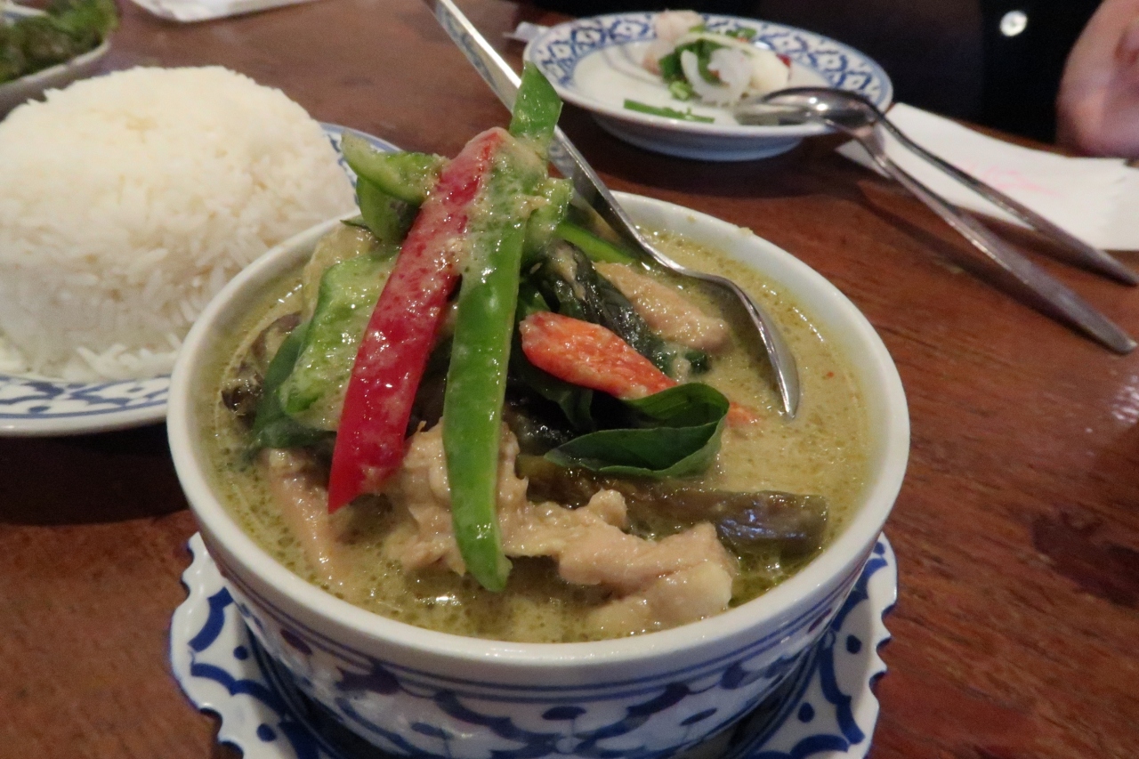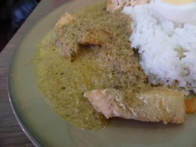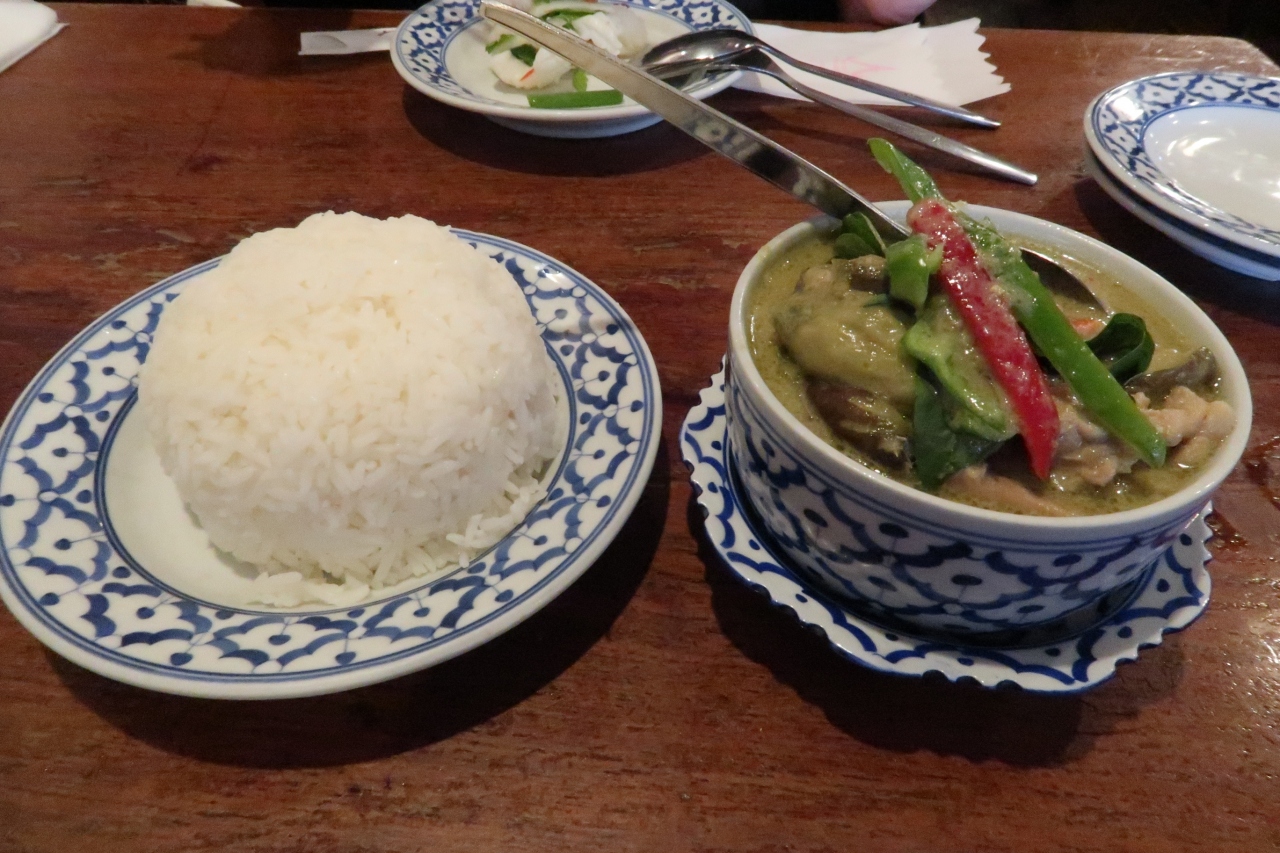 ●グリーンカレーSサイズ(鶏肉で)、ライス 初めはココナッツミルクの甘さを感じますが、後からじんわり辛味も。茄子が煮込まれてやわらか過ぎる気はしましたが、やはり市販のペーストで作ったものとは違い、バイマックルーをはじめハーブを香りと味が抜群にいい。