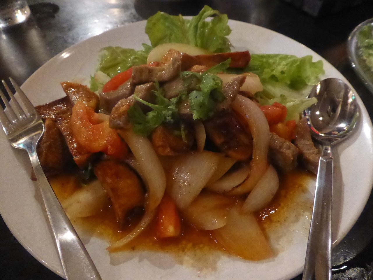 ●牛肉の野菜炒め フライドポテトが入っている珍しい炒め物。牛肉は少し厚みがありますがたぶん外国産なのかかなり硬め。今回注文した中では一番普通でした。