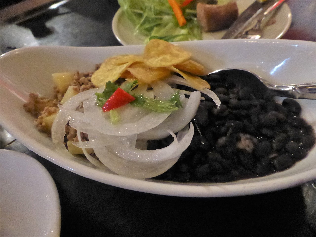 ●キューバンセット(そぼろご飯と黒豆シチュー) 今回一番美味しかったのがこれ。ご飯はじゃがいもと炊き込んだもので、そぼろは日本食とほぼ同じ。肉の旨味も十分で食べやすい。黒豆シチューはほんのりスパイスが効いています。家庭料理だと思いますが、初めて食べる黒豆の味わいが新鮮で素朴な味わいながら絶品でした。