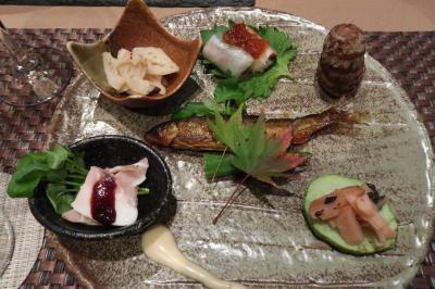 ●忍野で育った岩魚の塩焼き、旬菜(ぎんなん天婦羅、蕗の薹お浸し)