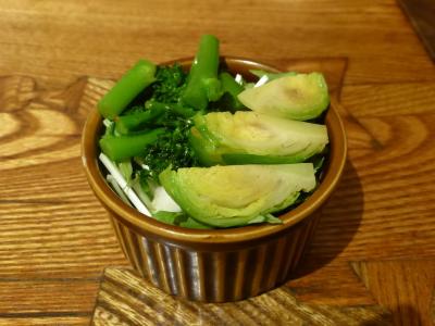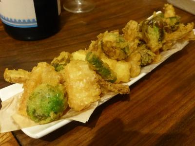 ●季節野菜のフリット 筍、新牛蒡、芽キャベツ他の4種という事ですが、人参、椎茸もあり5種類が山盛り。軽やかな揚げ上がりで程良い塩分が野菜の味を引き立てます。歯ごたえもあり、特に芽キャベツは絶品。
