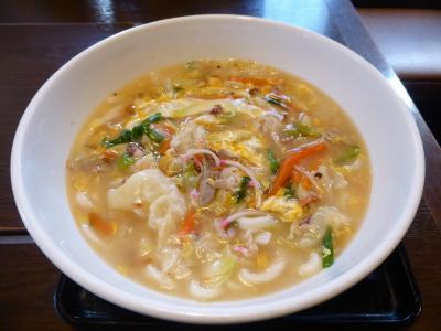 ちゃんぽんうどんは相方のセレクト。キャベツ、人参、細切り蒲鉾に浅利、げそ、豚肉が少々。こちらのうどんはやわらかな麺。白湯スープは魚介の出汁も出ているのですが、味わいとしては普通。トータルで考えれば可もなく不可もなくですが、野菜を多く取りたい方にはいいかと思われます。