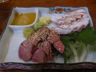 ●鳥刺し レバーはゴマ油で。エッジもしっかりしており見るからに新鮮。弾力のある肉質で濃厚な味わい。ササミはたたき風。こちらは醤油で。にんにく、山葵、生姜が添えられていますが、これは生姜が良く合います。淡泊ながらもねっとりした身が美味しい。