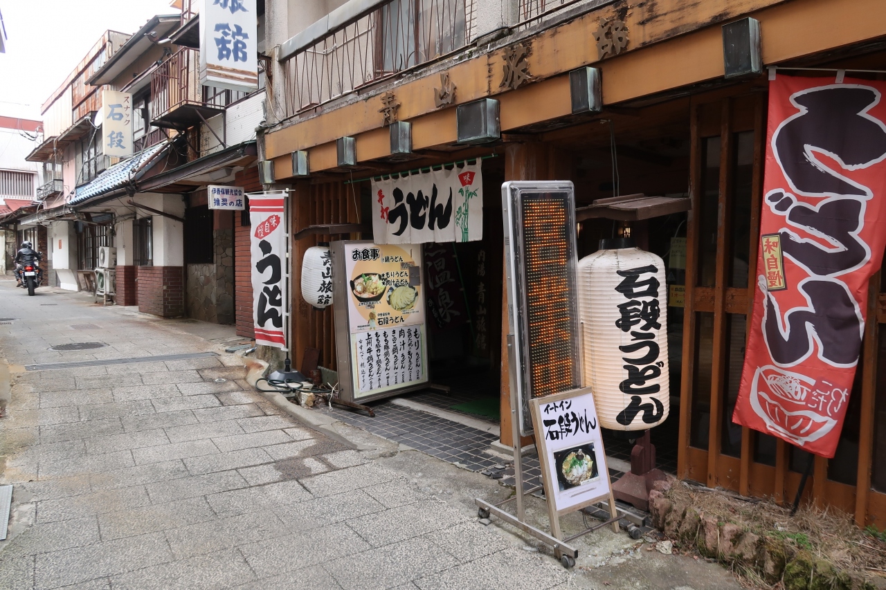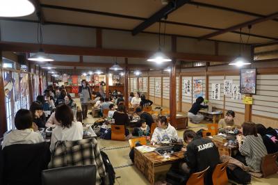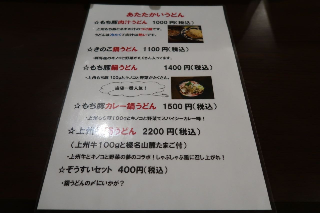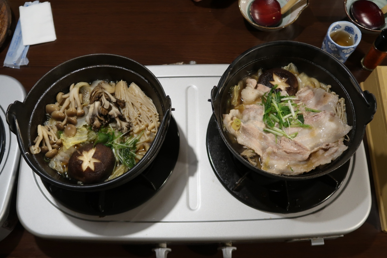 伊香保旅行の際のランチで訪問。店は青山旅館の玄関から入り、フロント横の階段を下りた地下1階。元宴会場だった大広間で営業されています。土曜日の13時前でほぼ満席でした。注文したのはきのこ鍋うどんともち豚鍋うどん。鉄鍋に盛り付けられた状態で提供され、テーブルのカセットコンロで火を通します。きのこ鍋うどんは椎茸、しめじ、舞茸、エノキ茸、白菜など具沢山。この中では椎茸が肉厚でジューシー。美味しかったです。うどんは煮込むので若干柔らかくなりますが、寒い日には体も温まるのでこれはこれで良し。もち豚鍋うどんは鍋は上州もち豚で覆われています。豚肉のコクと脂の甘みがあり食べ比べるとこちらの方が断然美味しかったです。伊香保にあるから水沢うどんと思いがちですが、水沢うどんとは一言も書いていません。その事を留意した上で頂く分には普通に美味しいと思います。
