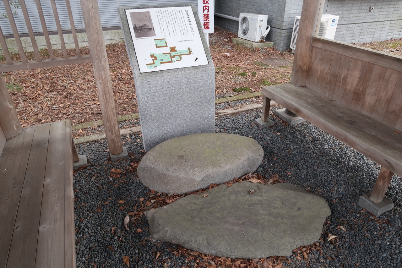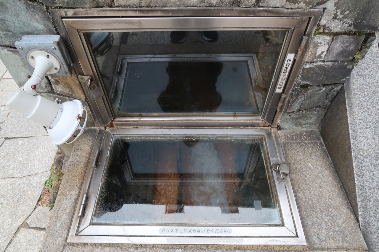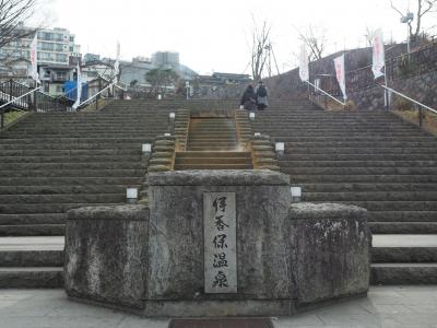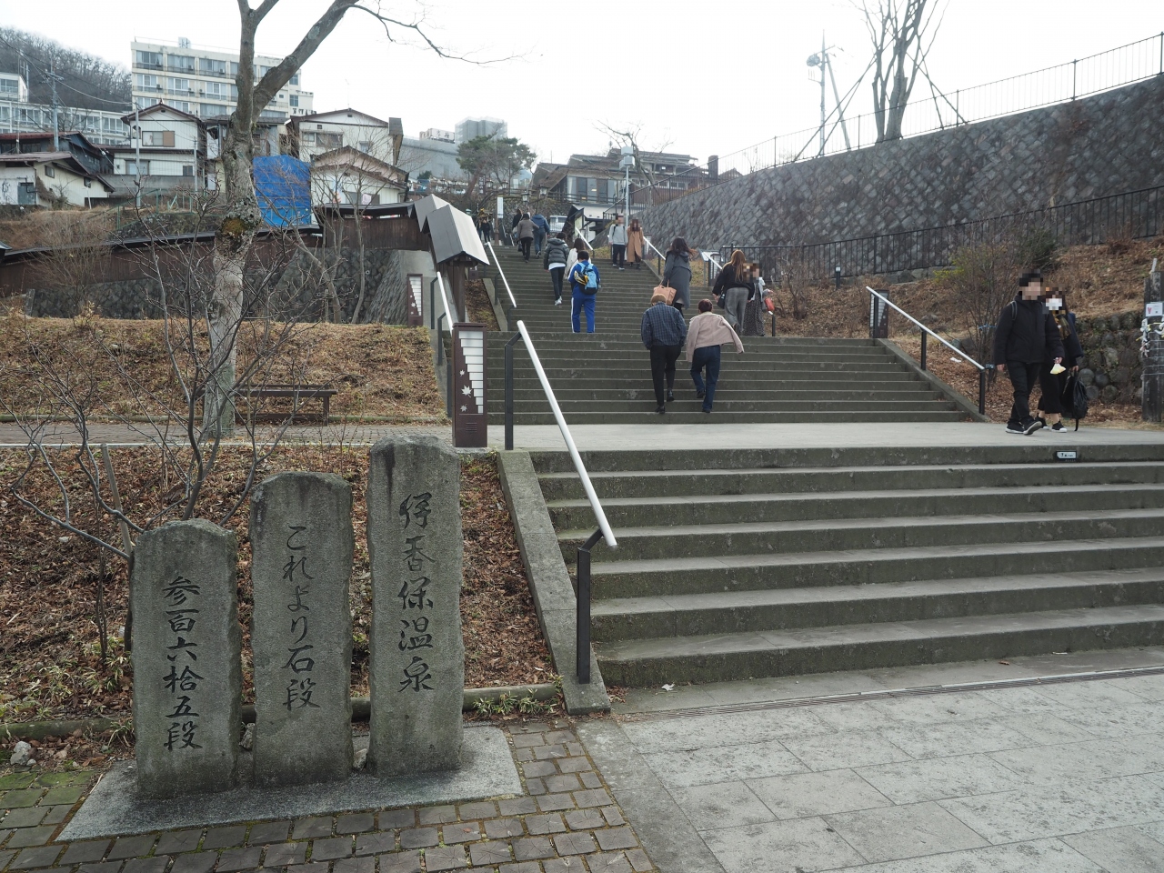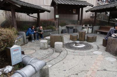 石段街の中ほどにある休憩所。岸権旅館の足湯と石段を挟んだ向かい側にあります。石段街を観光や食事処などを探していると、登ったり下りたりすることになり少し休憩しました。テイクアウトしたものを食べている方もおられたので、場所としてはちょうどいい場所にあると思います。特に見所というほどではありませんが、地面に埋め込まれた貝殻は姉妹都市である逗子市の海岸のものだそうです。