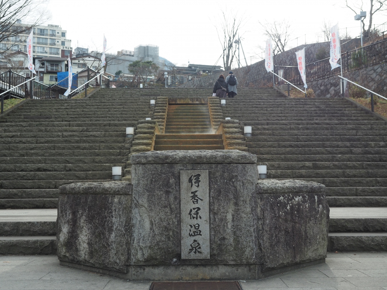 石段街からは少し外れ、ホテル松本楼の近くにある公園です。公園としっても遊具があるわけではなく、明治43年に開業した伊香保電気軌道を実際に走っていた車両が展示されています。所謂チンチン電車ですが現在のものより細身で、車両の色は伊香保温泉の色を模したのか、ベージュと茶色のツートンカラー。非常に趣きがありました。看板の解説によると、渋川からは急勾配でスイッチバックで上り、その代り帰りはトロリーポールを架線から外し下り坂の惰性とブレーキ制御だけで戻れたというから驚きです。
