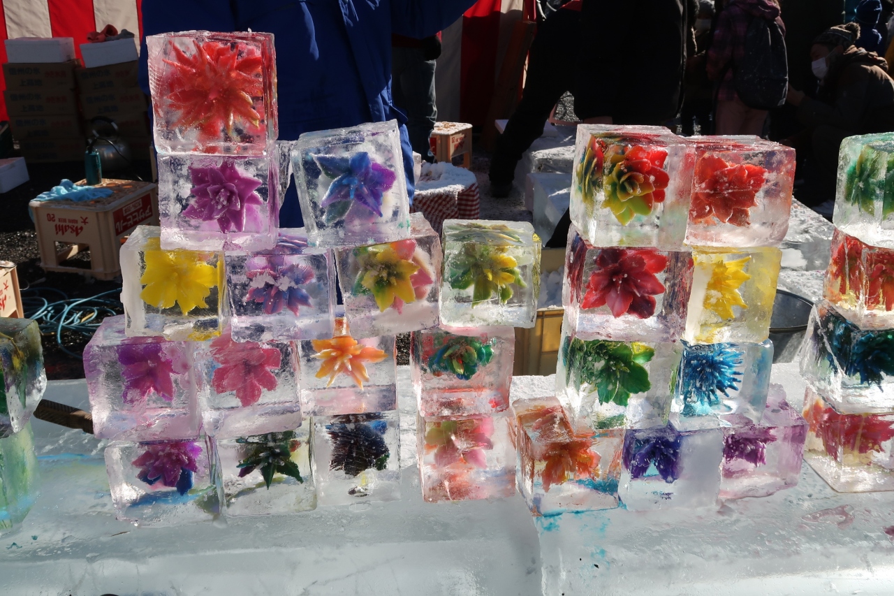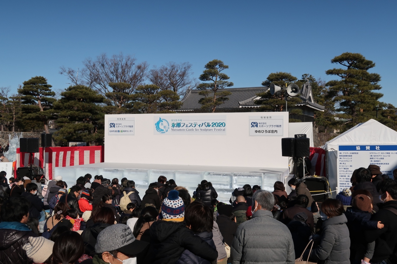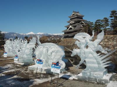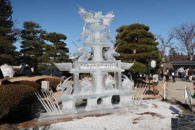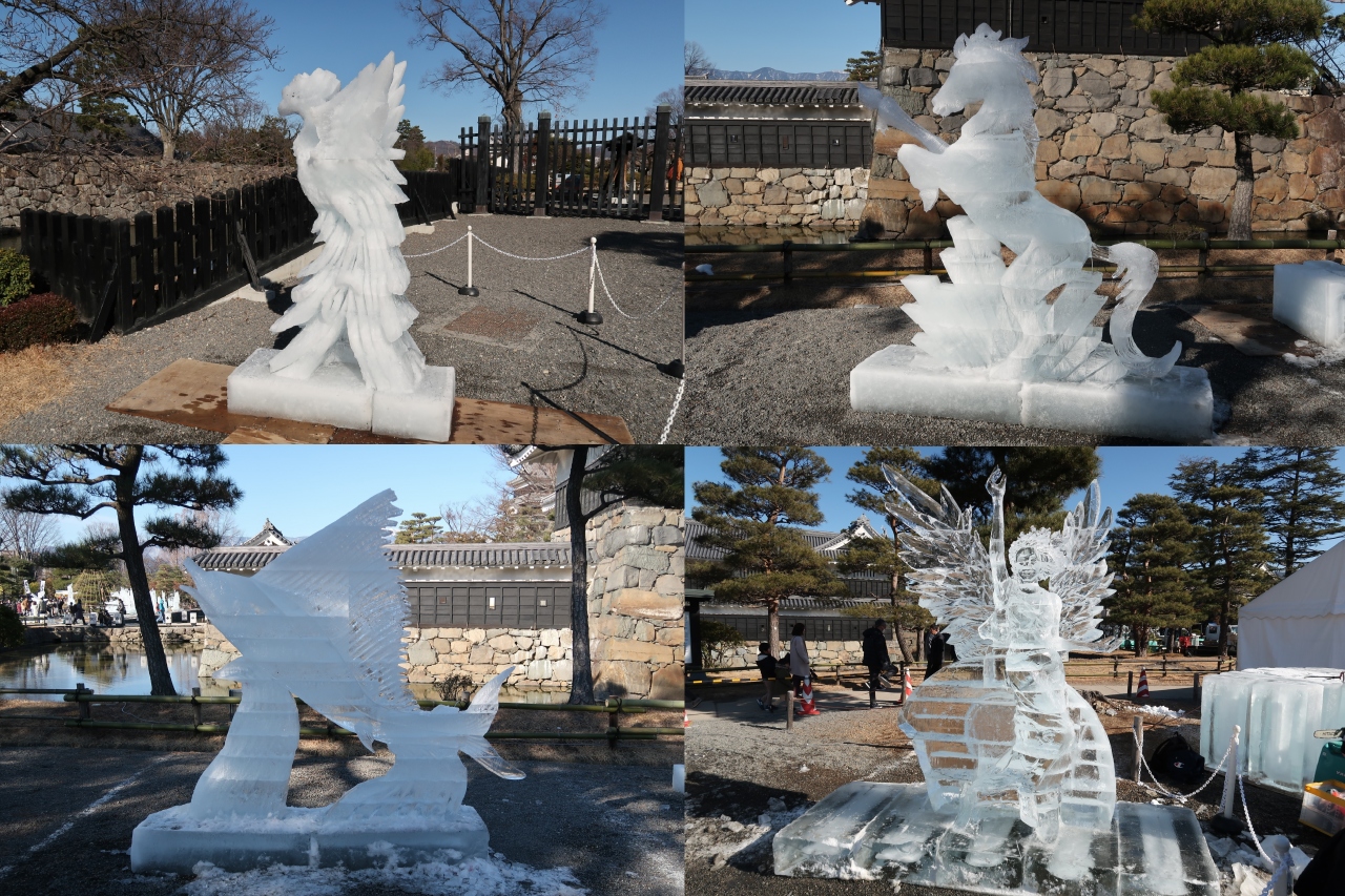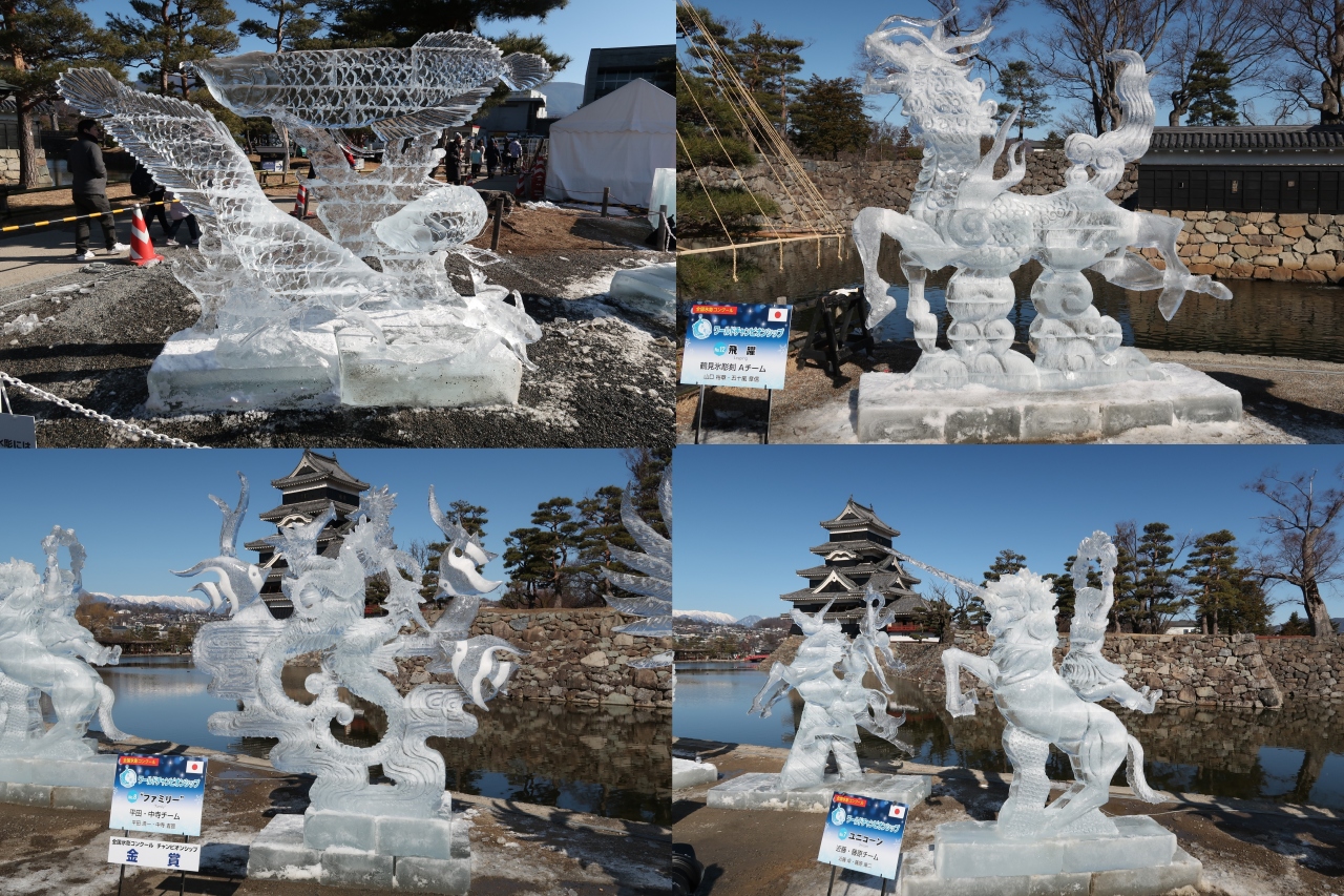 信州温泉旅行の際に催されており見学しました。この「国宝松本城氷彫フェスティバル」は2020年で34回を数え、世界大会として6カ国の選手が競い合う「ワールドチャンピオンシップ」などもある有名な大会。規模も大きく、舞台では和太鼓やダンスも披露されていましたが、やはり氷彫作品が素晴らしい。細かな細工や曲線に掘られた魚やタツノオトシゴ、ユニコーンなど何れ劣らぬ作品ばかり。そして美しい松本城を背景にズラリと並ぶ作品の姿はそれだけで素晴らしく目を奪われました。見応え十分の催しで、これ目当てに松本を旅するのもいいかもしれません。