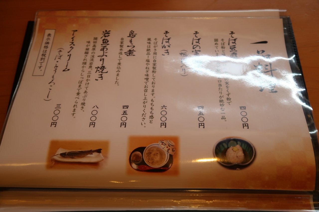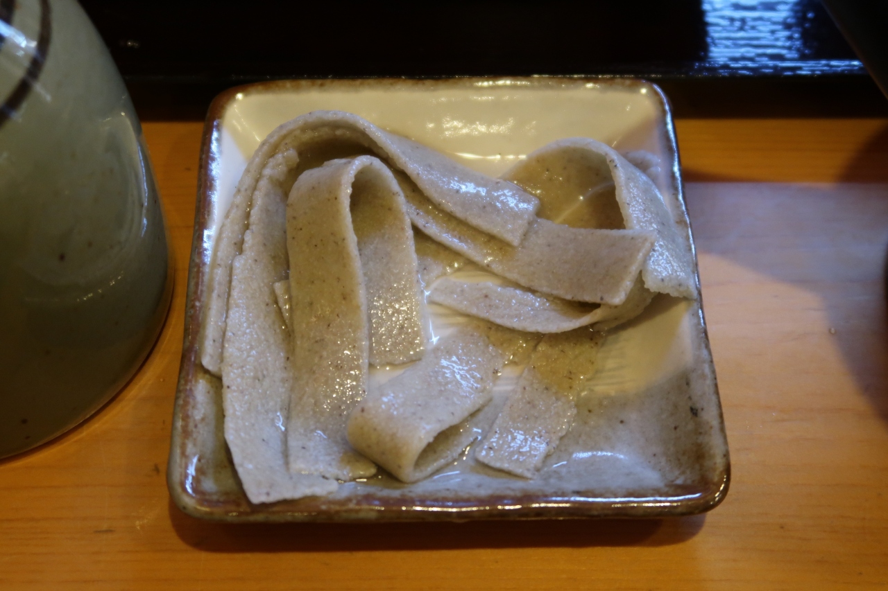 そっと顔を近づけると蕎麦のいい香り。塩で頂くとより風味を感じます。香りつゆに少し浸して食べると本当に美味しい。一方甘みつゆは少し合ってない気がします。そして麺としての食感もあり、噛む事によって蕎麦を味わえました。サービス(?)で同じ蕎麦の幅を変えたものをとして頂き、こちらはもちもち。同じ蕎麦でもこんなに食感が変わるのですね。松本には美味しい蕎麦屋が多いですが、十割蕎麦を食べるのであればお勧めです。- 旅行時期