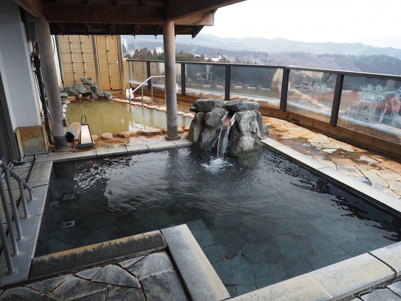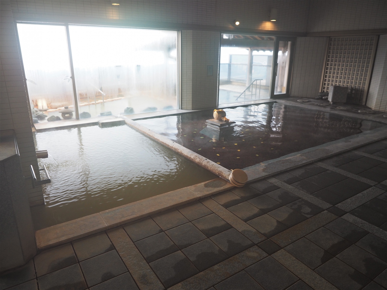 松本楼の姉妹館である洋風旅館ぴのんに宿泊すると、こちらでも入浴できるので大浴場を利用しました。1日目は8階の吉祥の湯が男湯。内湯、露天風呂共にこがねの湯としろがねの湯が(加温していますが)かけ流し。しかも露天風呂からは赤城山や小野子山などが見渡せ眺望も楽しめました。翌日は2階の大黒の湯へ。どちらも同様に広々しており快適に利用でき、お風呂に関しては申し分なしでした。