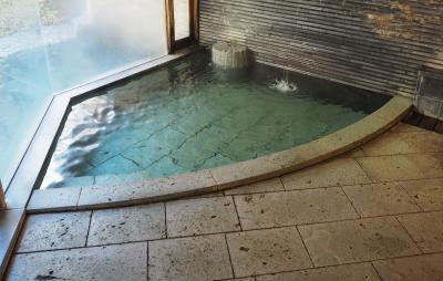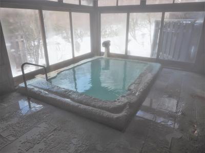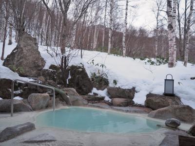 お風呂は男女別内湯と貸切露天風呂が1つ。お湯は自家源泉で小梨の湯。含硫黄 - カルシウム・マグネシウム - 炭酸水素塩温泉の湯が源泉かけ流し。白濁というよりミルキーブルーのような色合い。貸切風呂は空いていれば30分を目安に自由に入れ、周り美しい白樺林を見ながら冬ならではの雪見露天風呂を堪能。さらに内湯の開放感が素晴らしく、浴槽の淵には温泉成分の析出物がびっしり。温泉好きには堪らない光景でした。