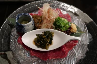 夕食は地下通路を通って、別棟の食事処で頂きます。「束間野会席」と名付けされた料理の数々はお酒のあてになるようなものがズラリ。特に宿の名物でもある馬刺しは刻みわさび、行者ニンニク、青唐辛子みそ、茗荷、青葱、生姜などお好みで巻いて食します。馬肉に香味野菜との組み合わせは新鮮。赤身と旨味と香りが交互に感じられ楽しい。その他、八丁味噌で煮た信州牛味噌煮、シラウオ、葉唐辛子甘酢、穴子と海老芋蒸し物、焼き筍、筍釜飯など。どれも美味しかったです。そして締めは館主自ら打った蕎麦(別注)。初めはそのまま。次に塩、一味、つゆの順で。まず香りが圧倒的にいい。そのままでもいいですが、塩で頂く方がより蕎麦の風味が際立ち一番美味しく感じました。