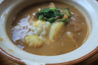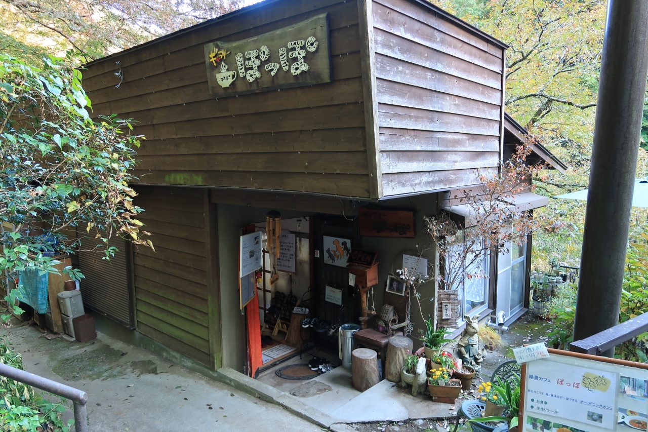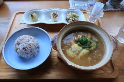鳩ノ巣渓谷沿いにあるカフェ。散策前に昼食を頂きました。店内の客席は鳩ノ巣渓谷を眺められるよう全て窓向きのカウンター席です。注文したのはごろごろカレー。カレーは別盛で土鍋に入っています。大きめの手羽中が1本と、じゃがいも、人参、カリフラワー、蕪、ほうれん草など。具材は大きく、文字通りごろごろ入っています。ベースはルーを使ったカレーだと思いますが、スパイスの広がりもあり後味は薬膳っぽい。味はまあまあですが、目の前の景色で少し上乗せされて感じました。