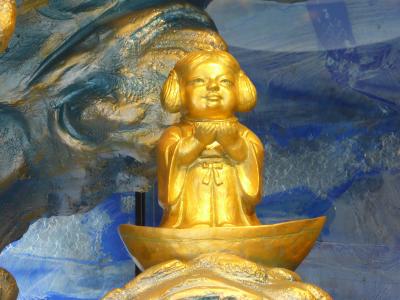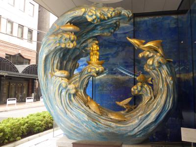 神田明神の二の宮の御祭神、少彦名命(えびす様)は現在、文化交流会館の横に鎮座しておられます。これは鳳凰殿竣工記念として金工作家の宮田亮平氏が制作したもの。えびす様は小さなお体ですが、大きな波の乗り、イルカや亀がそれに呼応するかのように作られており、非常にダイナミックでした。