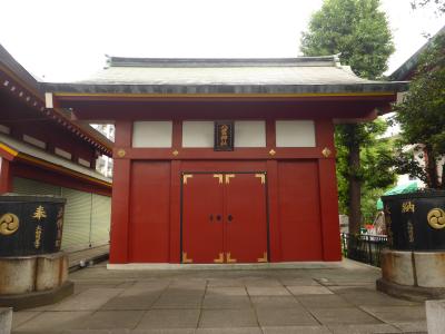 神田明神の境内にあります。御祭神は建速須佐之男命で江戸時代以前から祀られていたと伝えられている由緒ある神社です。柱、扉が綺麗な朱で統一されており、一見すると門の扉が閉まっているだけのように見えます。ただ扁額と天水桶は立派なもので見所はこの二つでしょうか。