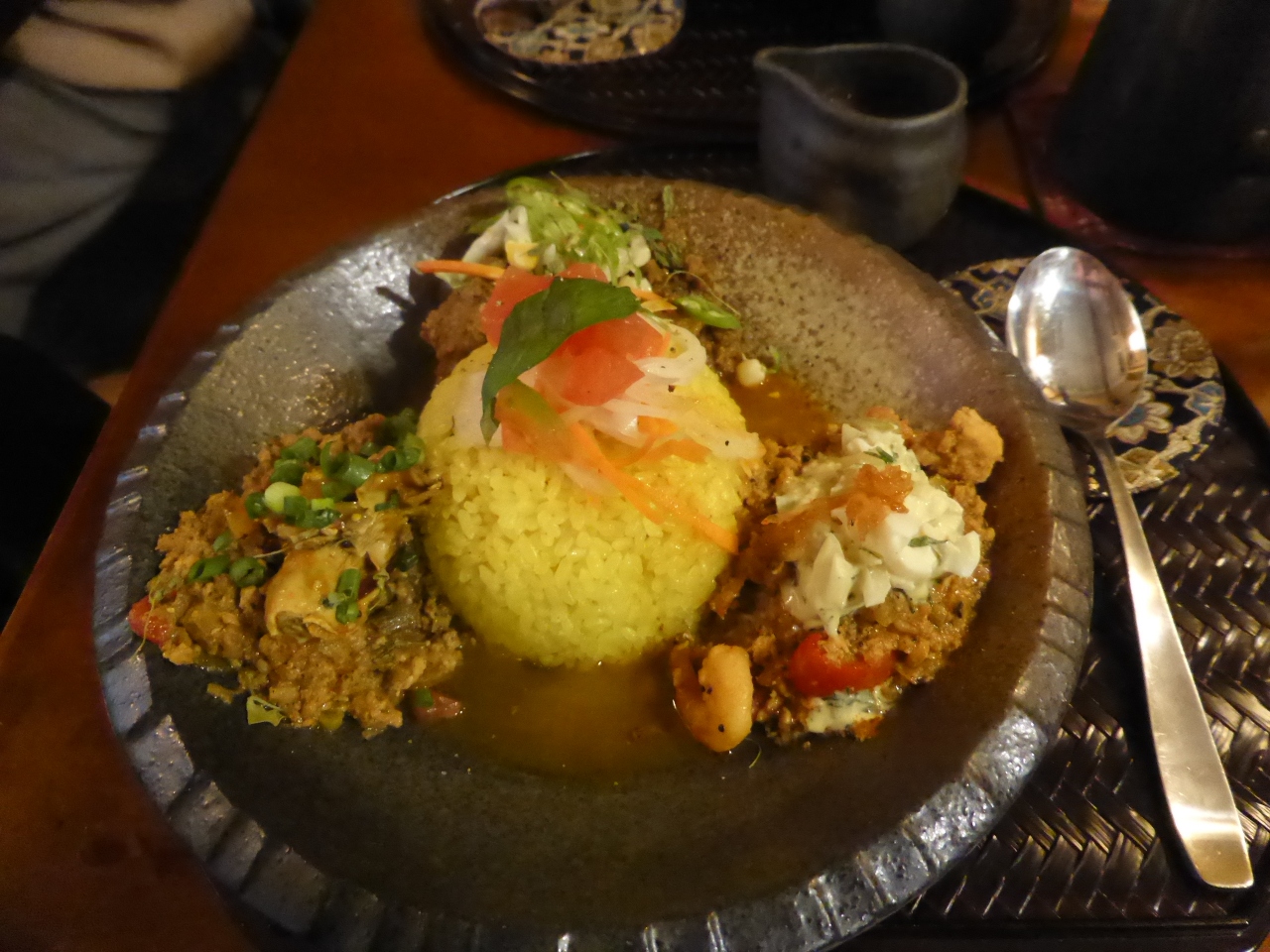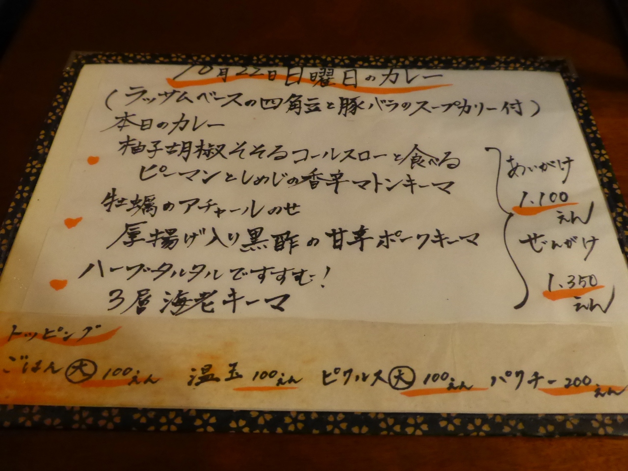大阪のスパイスカレーの人気店が東京に初出店したお店です。お店は下北沢の王将を超えてすぐになります。開店時間前に着きましたがすでに行列。なんとか一巡目に入店できました。変わったキーマカレーが楽しめ、当日は①柚子胡椒そそるコールスローと食べるピーマンとしめじの香辛マトンキーマ、②牡蠣のアチャールのせ、厚揚げ入り黒酢の甘辛ポークキーマ、③ハーブタルタルですすむ、3層海老キーマの3種類。スパイスもしっかり効いていてどれも美味しかったです。人気店で混雑するのでお早目に。