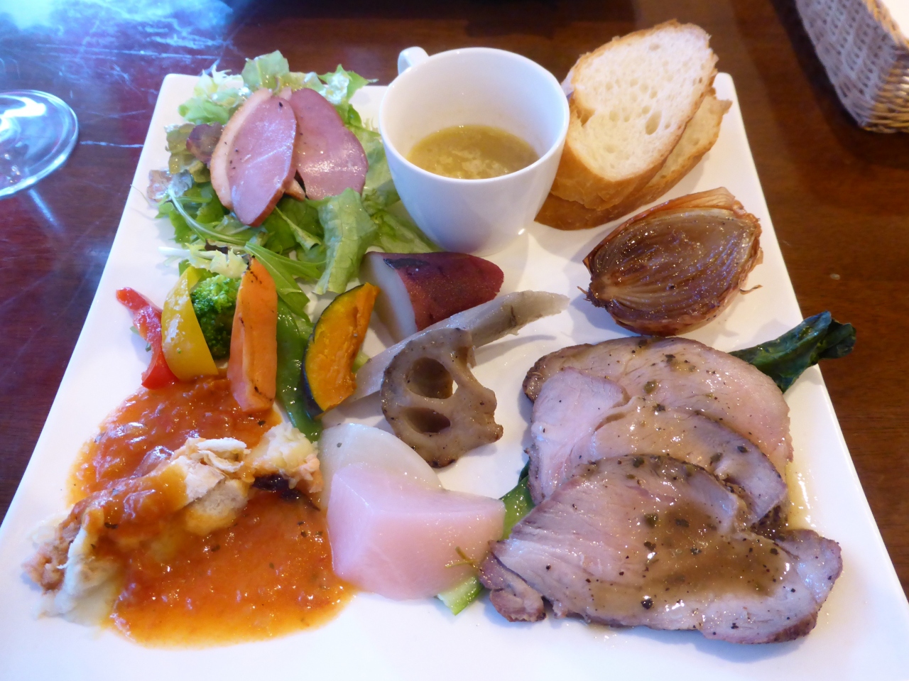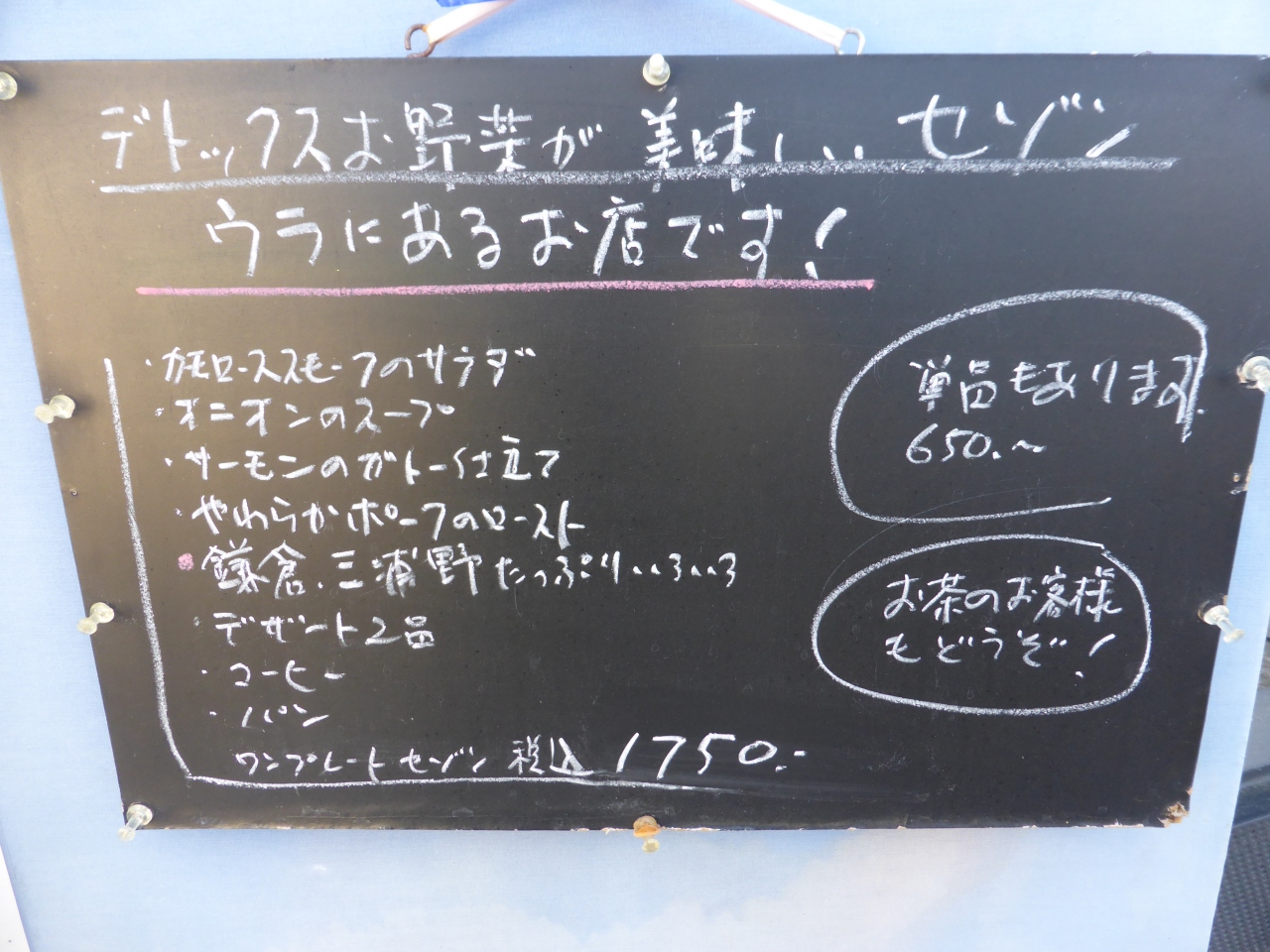 ランチで訪問。報国寺拝観を終えた時点で13時も過ぎ、近くで食べようと表にあった看板のメニューを見てこちらに伺いました。先客はおらず一瞬不安がよぎりましたが、そのままテーブル席に着席。注文したのはワンプレートセゾン。肉、魚、野菜が一皿に盛られています。当日の献立は鴨ローススモークのサラダ、オニオンのスープ、鱧とじゃがいもトマトソース、やわらかポークのロースト、鎌倉、三浦の野菜いろいろ、デザートなど。一つ一つ丁寧に作られています。特に野菜が本来の味を楽しめ、ローストされた玉葱、さつまいもが想像以上に甘く驚きました。またローストポークはしっとりした焼き上がりでジューシー。グレイビーソースも味わい深く絶品。全く下調べせず偶然伺ったお店ですが、結果は大正解。料理はどれも美味しく、このワンプレートはお店の魅力が凝縮されていました。