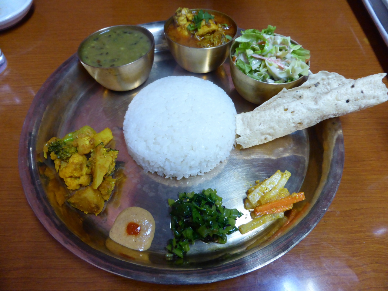 ネパール料理を食べてみたくなり、ランチで訪問。外観の写真は確認していたので、迷わず到着。入口を入って左奥がレストランのスペースになります。ネパールセットでチキンとベジ、単品メニューからモモを注文。モモは丸い形ではなく、餃子型(たぶん市販の皮)だったのは残念ですが、スパイスと餡の挽肉と野菜がいいバランスでおいしいです。カレーのチキンは骨付きの肉なので、旨みたっぷり。またスパイシーさがインドのものとは異なり、辛味は少なくカルダモンが効いていて新鮮です。ダルのスパイスは控えめでやさしい味わいです。ベジはカリフラワーとじゃがいもがメイン。カレーというよりは野菜煮込みといった趣です。サグ、辛味の少ないアチャールも付きお腹一杯。ダルとライスなどのおかわりを勧められましたが無理です。初めてのネパール料理でしたが、食べやすく口に合いました。内容と照らして若干値段は高いように感じましたが、満足しました。