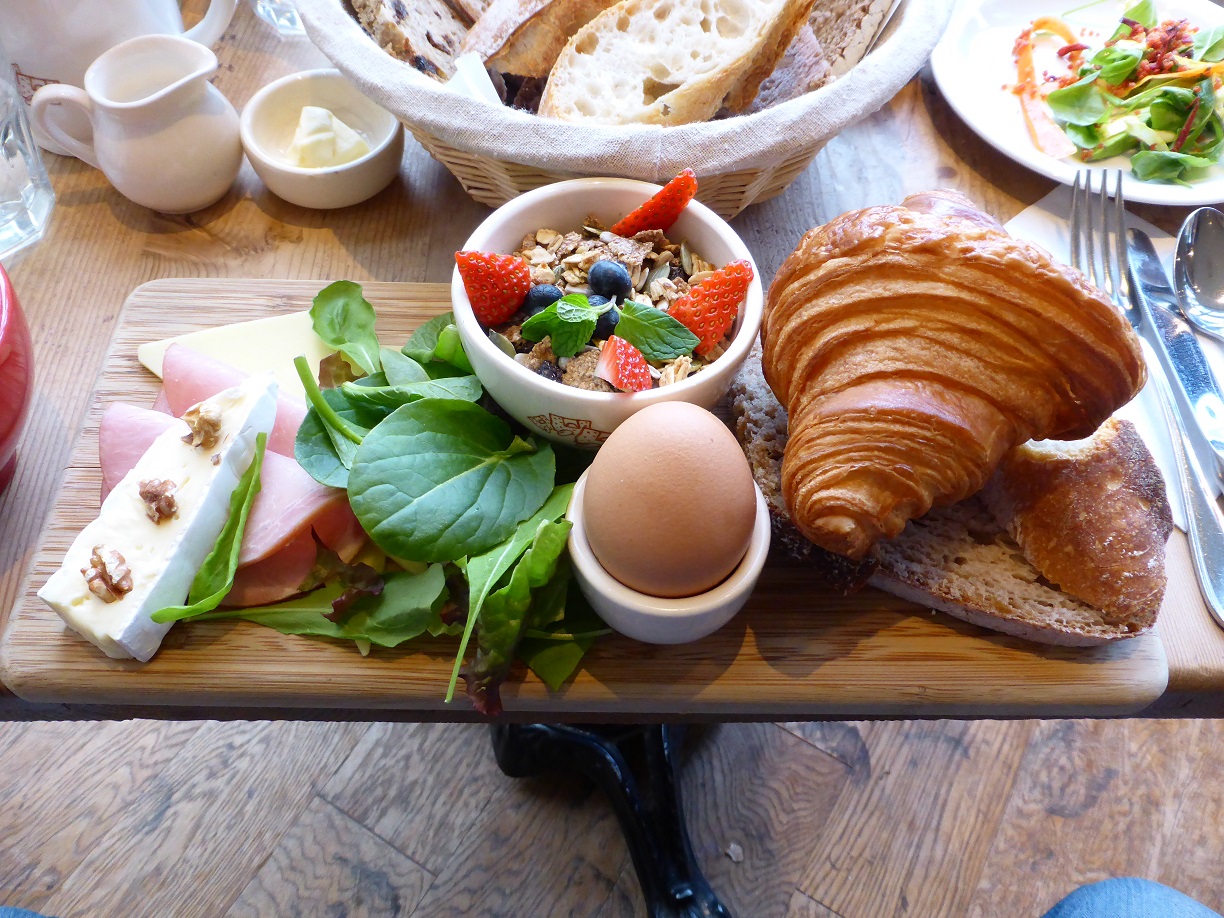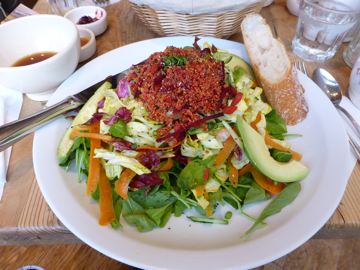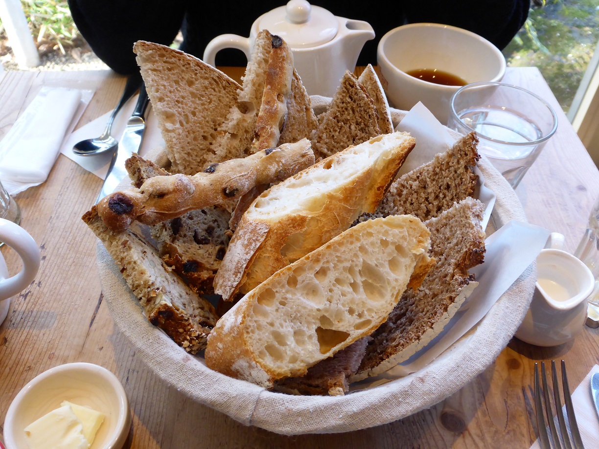 素材に拘ったベーカリー併設のレストランです。ランチで訪問。11時少し前で3組待ちで店内で待つ事10分。奥のテーブル席に案内されました。注文したのは、キヌアデトックスサラダ、ファーマーズランチ、ベイカーズバスケット(ラージ)、サラダには飲み物が付かないのでコーヒー(ポット)を1つ。ベイカーズバスケットは小麦は全てオーガニックで全粒粉パン(ウィート・パン)、バゲット、ライ麦パン、スペルト小麦のパン、くるみパン、五穀パン、ヘーゼルナッツとレーズンのフルートと盛り沢山。それぞれが味わい深く美味しいです。ファーマーズランチのパンはクロワッサンに。バターの風味もしつこくなく、軽い食感が旨いです。グリエールチーズとブリーチーズ、ロースハムがつきますが、どれも上質。バケットにハムとチーズを乗せて食べると絶品でした。キヌアデトックスサラダは予想していたものよりボリューミー。皆歯ごたえがあり、ドレッシングも薄味で野菜そのものの味が良く分かります。パン食べきれず持ち帰り。値段は少々高く贅沢なランチになってしまいました。しかしオーガニックや素材に拘ったものを使っているので、その点を考えれば妥当な値段ではないでしょうか。