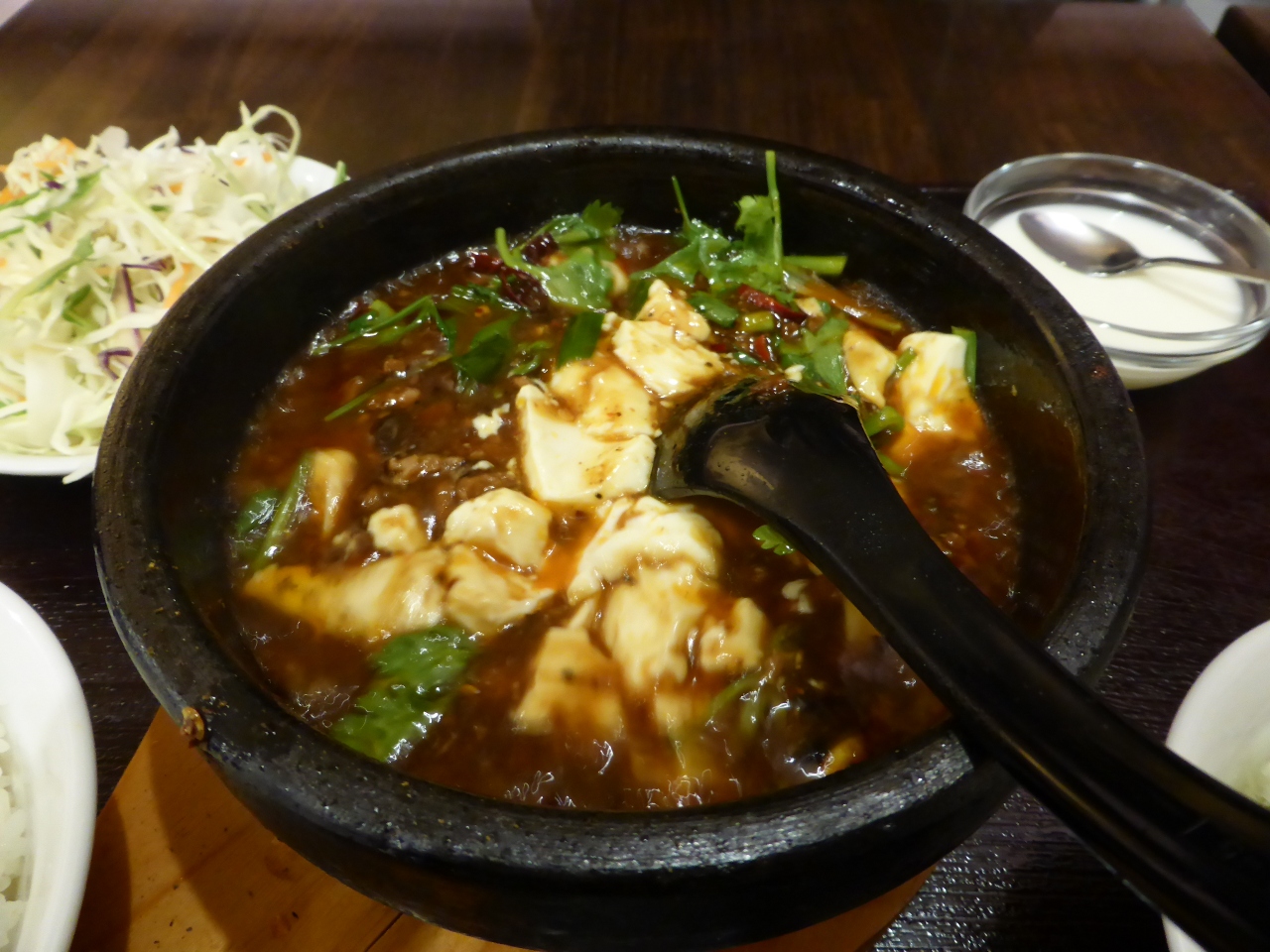 火焔山香草麻婆豆腐は石鍋入りで、前掛けを渡されます。そして店員さんが豆腐を崩しながら混ぜるとまさに煮えたぎるようにグツグツ。アツアツを口に頬張ると、旨さと辛さが交互にやってきます。熱いからか、こちらの方が結構辛く感じます。そして花椒のしびれ感が口を襲い美味しい麻婆豆腐でした。