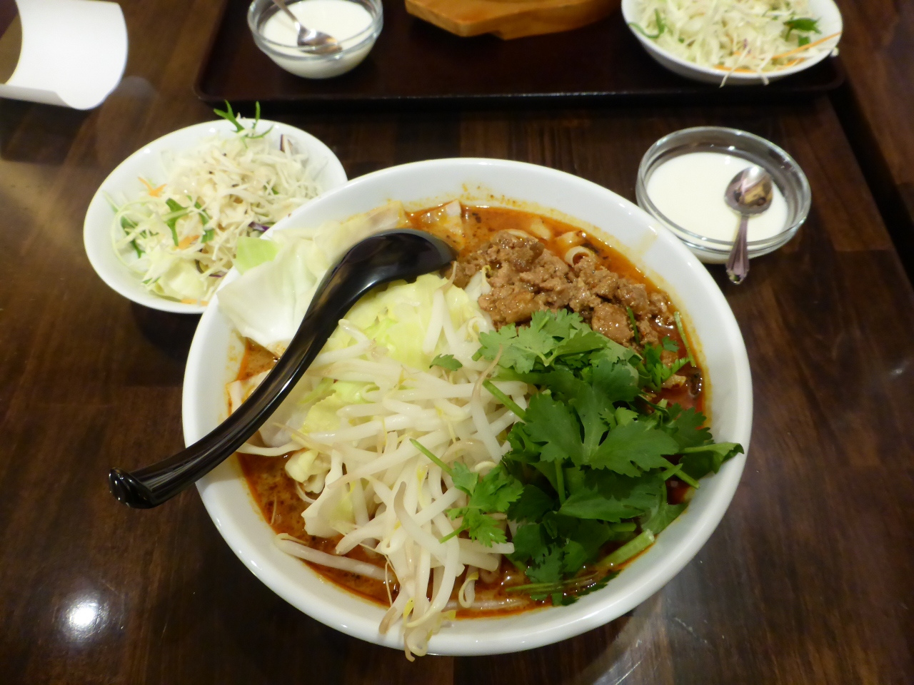 麻辣刀削麺は茹でキャベツ、もやし、肉味噌入り。スープはチーマージャンのマイルドさを感じ、後からじわじわと辛味が追いかけてきます。しかし中辛では丁度良い辛さ。鶏ガラスープと胡麻の風味、辛味が混然一体となって旨いです。刀削麺も程よい歯ごたえで、スープがよく絡みます。パクチーの香りと花椒のしびれ感で心地いい辛旨な味わいです。