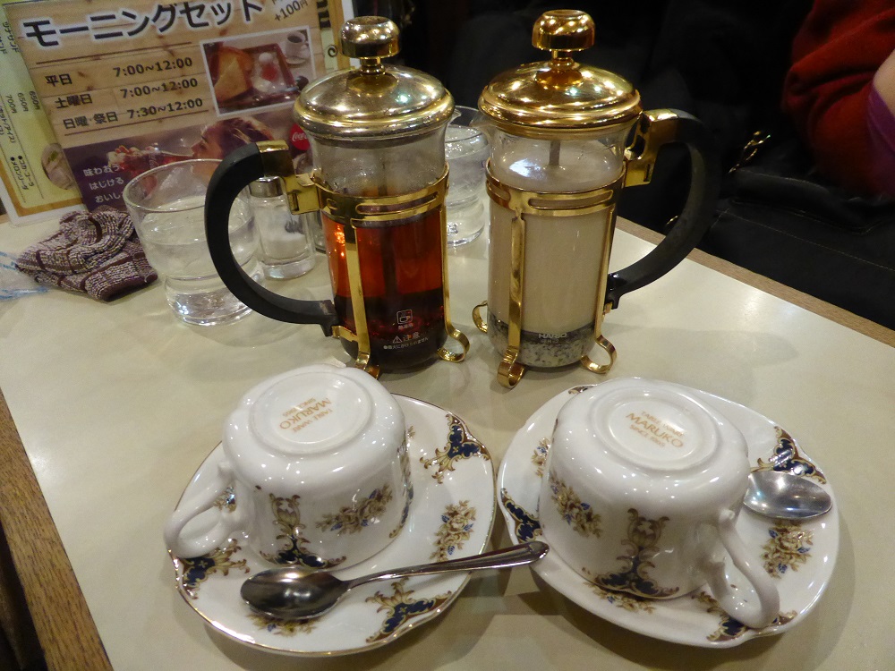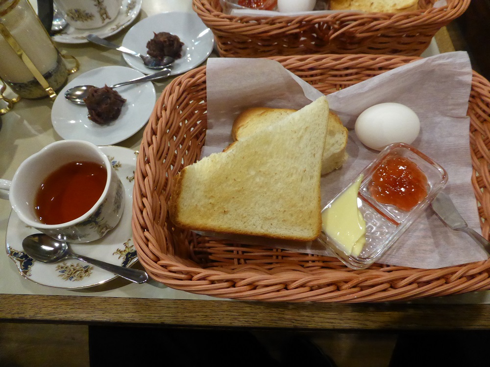 四万温泉旅号は八重洲口から出発。その前にモーニングを頂きました。八重洲の地下街にありながらも店内は昔の喫茶店という雰囲気。8時過ぎで満席です。注文したのは紅茶とロイヤルミルクティーで+100円でモーニングセットを付けました。モーニングはトースト、茹で卵、マーガリン、ジャム、小豆あんがセット。まずトーストが厚切り。表面はカリッ、中はふわっとやわらか。何より食べ応えがあります。半分はマーガリンとジャムで味の変化もあり十分でした。喫煙可なので少々煙たい時もありますが、まだこんな喫茶店があるんだと懐かしく感じました。