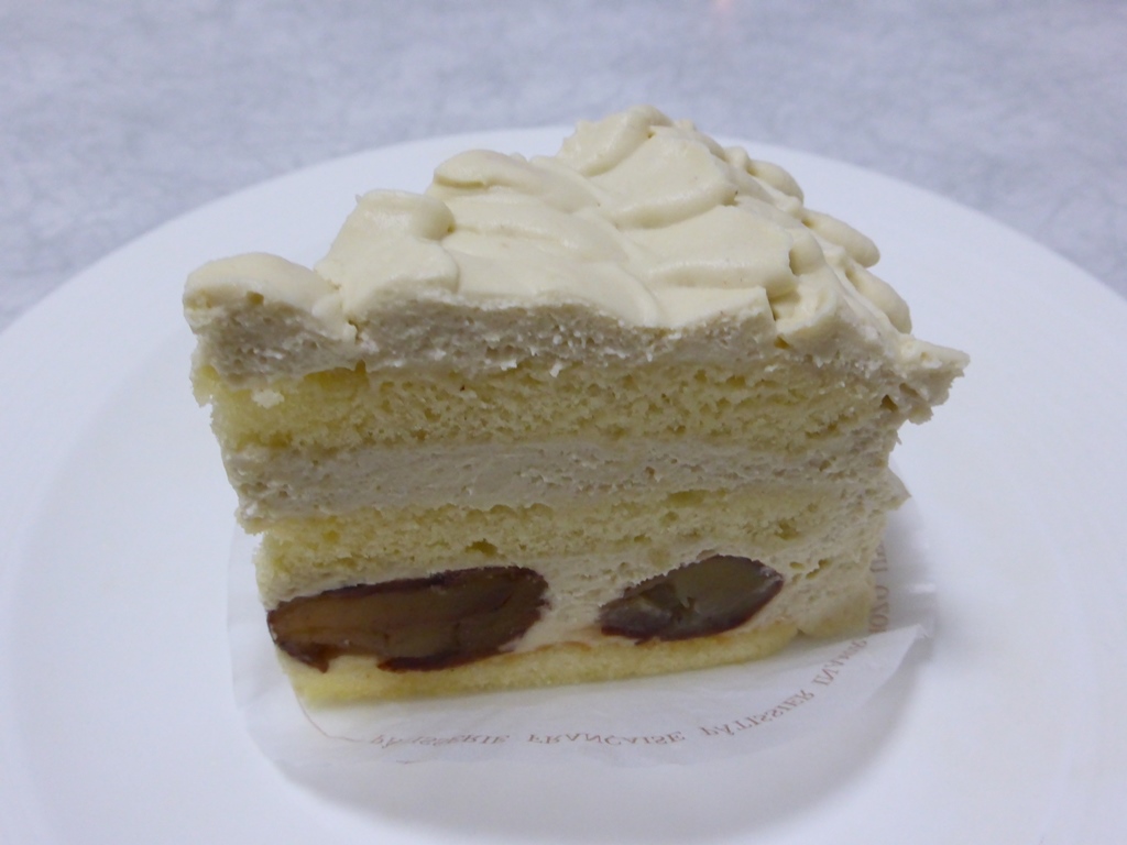 和栗のショートケーキ。クリームにも栗のペーストを混ぜ込んだもので、美味。スポンジに入っている栗は渋皮煮で味わい深いです。