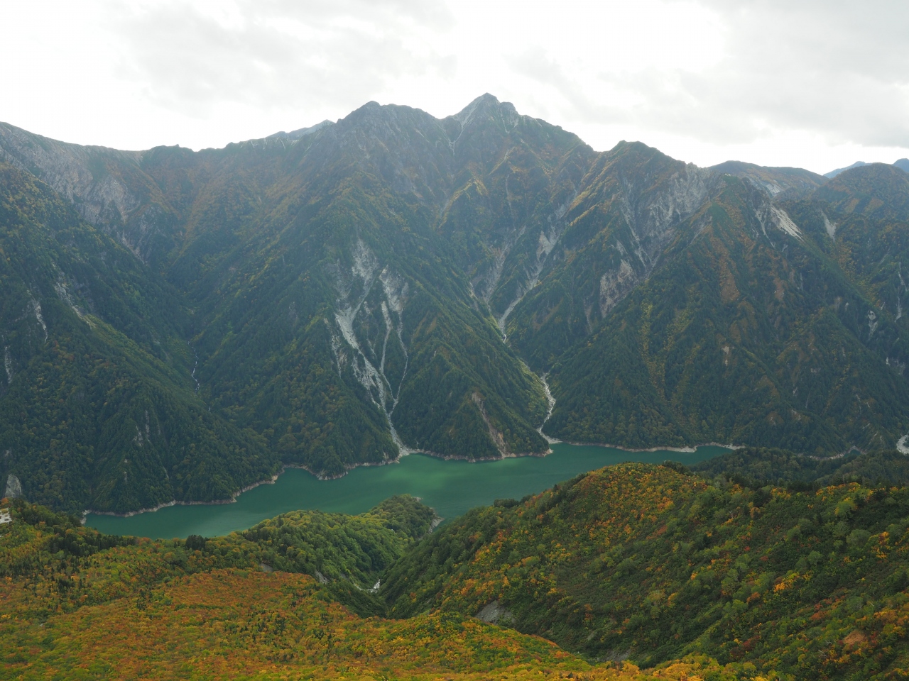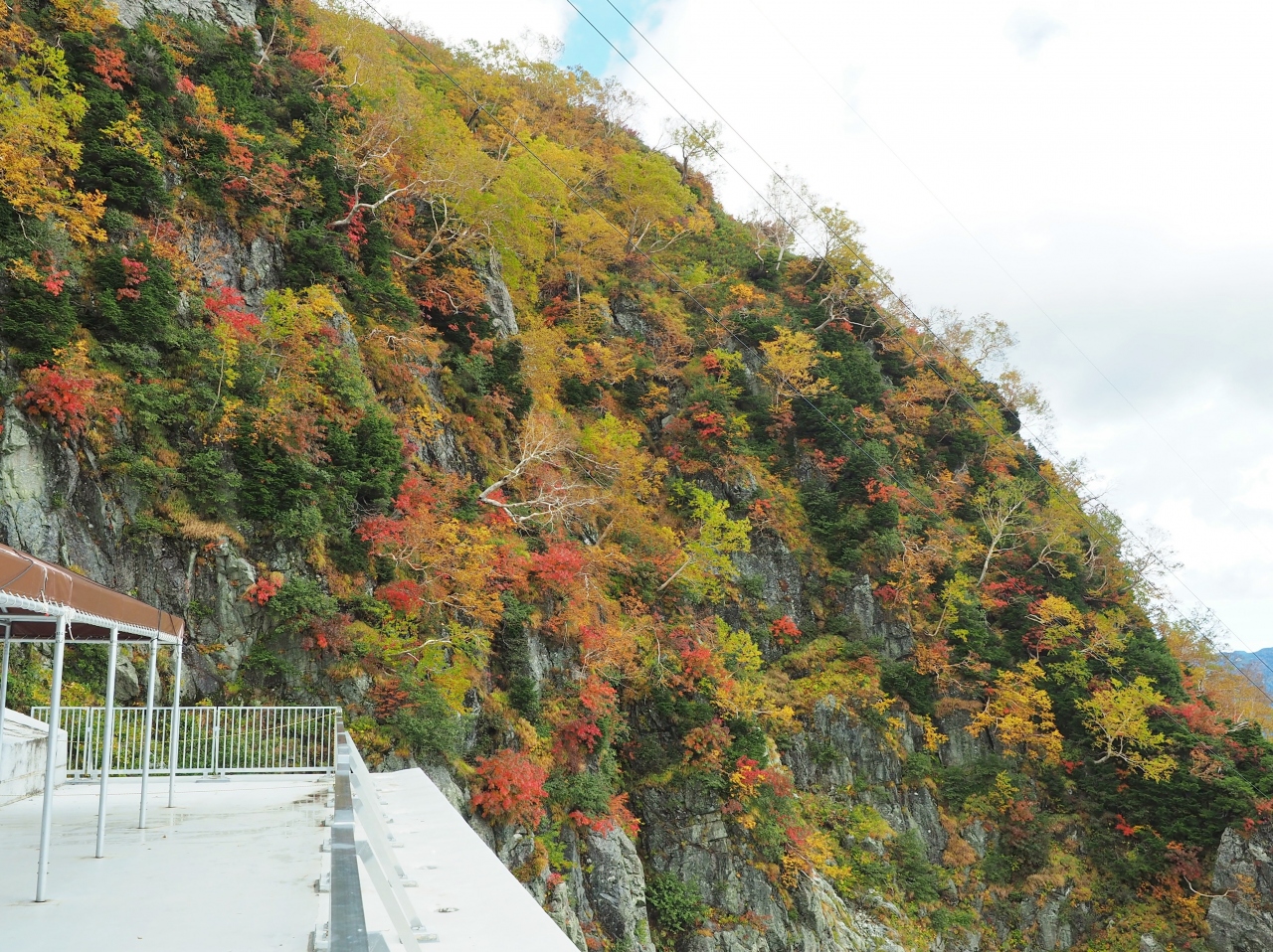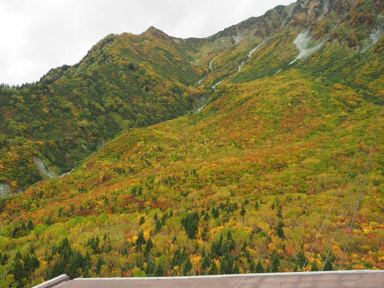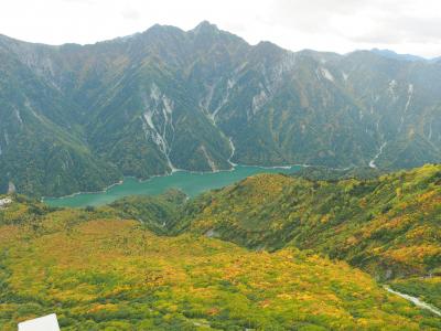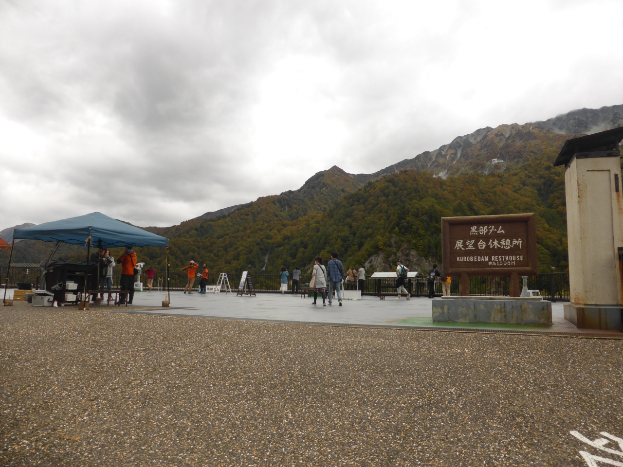 大観峰駅の屋上にある展望台です。荷物を持って階段を登るのは少し辛いですが、その眺めは抜群。後立山連峰、黒部湖が一望です。しかも2018年は少し紅葉が早く、9月末でタンボ平も色づき半ば、展望台の横から上部は見頃でした。晴れていれば素晴らしい景観が楽しめるので登る価値はあります。