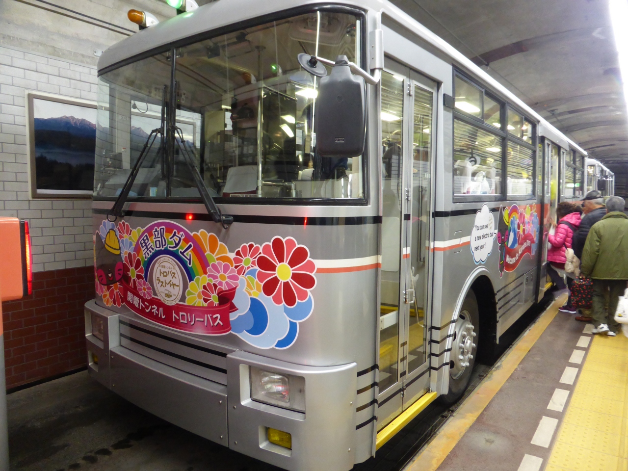 黒部ダムと扇沢間6.1kmを16分で結ぶトロリーバスです。ずっとトンネルの中を走るので車窓からの眺めはありませんが、車内アナウンスで説明していただけます。有名な黒部ダム工事で最難関だった破砕帯を通りますが、看板があるだけでアッという間に通過します。とは言え2019年からは電気バスになり、関電トロリーバスは今年が最後。乗り納めできてよかったです。