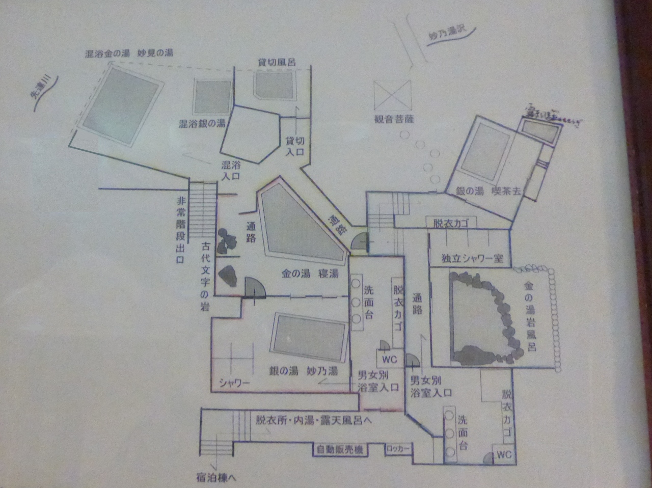 妙の湯には金の湯、銀の湯の2つの源泉の湯が引かれており、内湯と混浴露天風呂それぞれの浴槽に注がれています。金の湯はこの辺りでは珍しい酸性泉・含鉄泉。錆色をした湯はなめらかでいいお湯です。また露天風呂は開放感抜群で砂防堰堤から流れ落ちる滝が目の前に見え大迫力。浴室もきれいで気持ち良く入れました。
