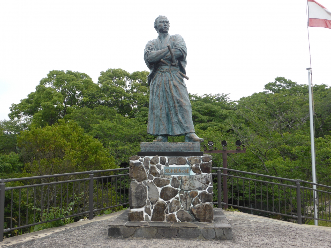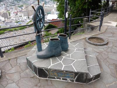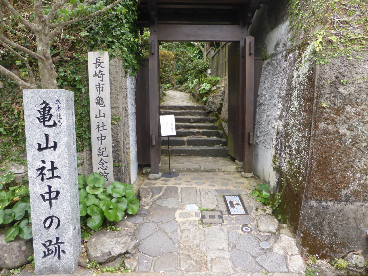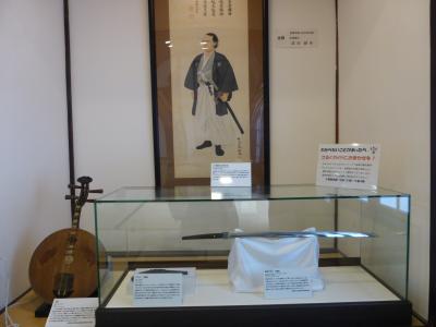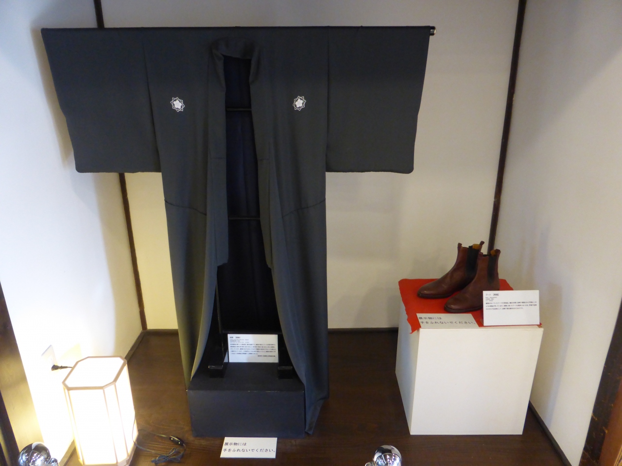 亀山社中跡に現在あるのが記念館です。中は復元したという事ですから、幕末そのままのものではないようです。龍馬が使っていたピストルやブーツ、紋服のレプリカが展示されています。レプリカという事に関しては賛否はあるでしょうね。写真撮影ができるのはこの第一展示室のみ。龍馬の書簡などが展示されている第二展示室は撮影禁止です。ひとつ気になるのは、パンフレットに書いてある、「坂本龍馬の亀山社中の遺構として今に伝わる建物を・・・」という一文。これは100%ではないという事なんでしょうか。