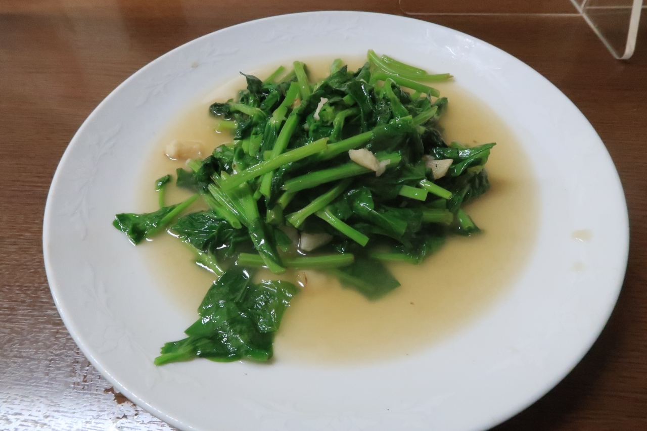 ●青菜炒め この日はほうれん草。にんにくたっぷりで塩加減もいい。
