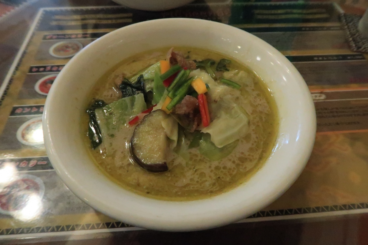 ●グリーンカレー 具は牛肉にキャベツ、ピーマン、茄子など。キャベツが入っているというのが新鮮ですが、特筆されるのは香草類の香りの良さと爽やかな風味。ココナッツミルクのクリーミーさと甘みで辛さはほどほどで食べ易い。ベースにはしっかりと旨味を感じるのでどんどん食べ進みました。後半はご飯に少量のナンプラーをかけ、カレーと合わせて食べると魚系の旨味が加わり、味変も楽しい。