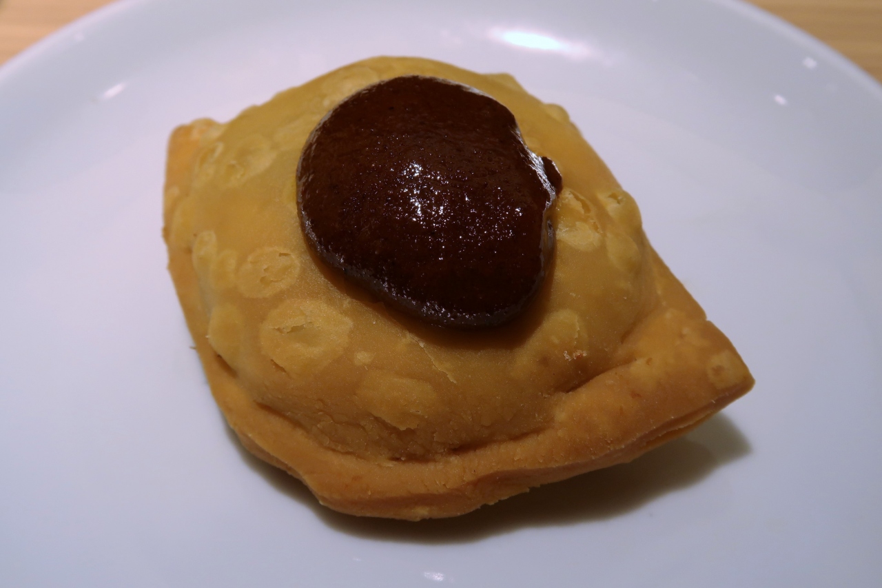 ●サモサ 具はじゃがいも、グリーンピース、マッシュルームなど。カラリと揚がっており、ナイフを入れるとサックリ。非常に香ばしい。具の塩味、スパイスは控えめで、その分ソースがスパイシーでコクがあり、いいバランスです。