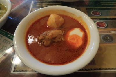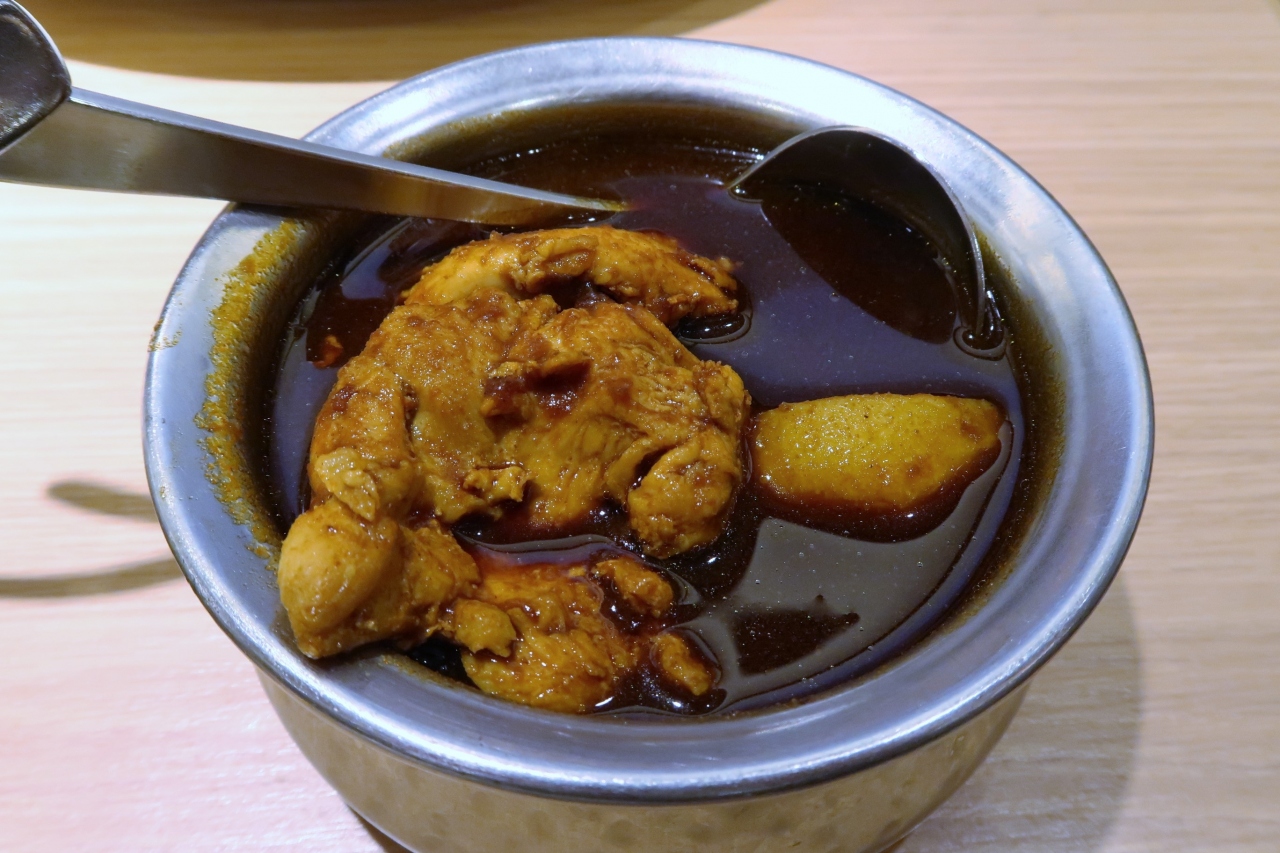 ●チキンカレー 具は手羽元1本、じゃがいも、茹で卵1/2個。メニュー表にはキケンな辛さとあり、少々ビビリましたが舌を突く辛さはありますが、十分食べられる範囲。ココナッツミルクのコクとスパイスで広がりのあり味わい。後からじんわりと辛みも追いかけてきますが、それも心地よい。手羽元はほろほろに煮込まれており、カレーと合わせると一層旨いです。