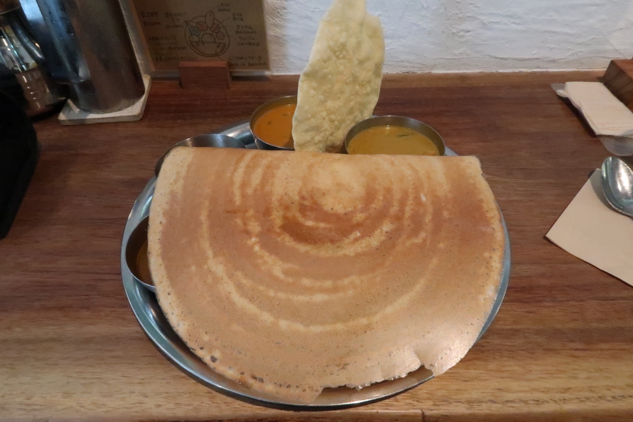 サンバルとラッサムは王道の味わい。ただこの2つは少々冷めていたのがマイナス。ドーサは豆の風味で独特の香ばしさ。それだけでスナックとして旨いですがカレーをつけてもライスとは違った味わいを楽しめます。どれも旨いので黙々と食べていると、ホールの方が「ライスのお代わりどうですか」と尋ね大きなスプーンでドンとのせてくれるサービスもいいですね。平日ランチでもこのクオリティとサービスの良さは特筆されます。- 旅行時期