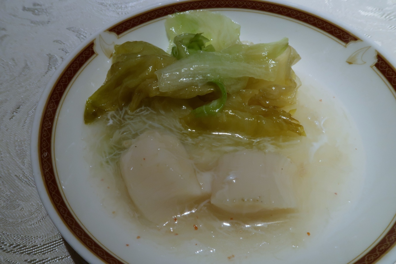 ●ほたて貝と野菜の蟹ソースかけ 帆立は肉厚でねっとりした身にはしっかり甘みを感じます。それだけでも旨味十分ですが、蟹ソースの相乗効果でこれは美味しい。