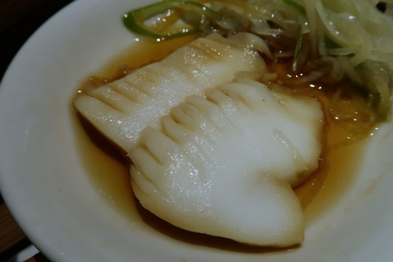 ●イカの葱、生姜セイロ蒸し イカはプリっとした歯ごたえ。硬すぎず軟らか過ぎず、切り込みも含めて絶妙。長葱と生姜の香りも良くさっぱり頂けます。しかし本当に旨かったのはこの蒸し汁で、旨味が凝縮。お行儀が悪いですが思わず小皿を取り出し全て飲み干しました。