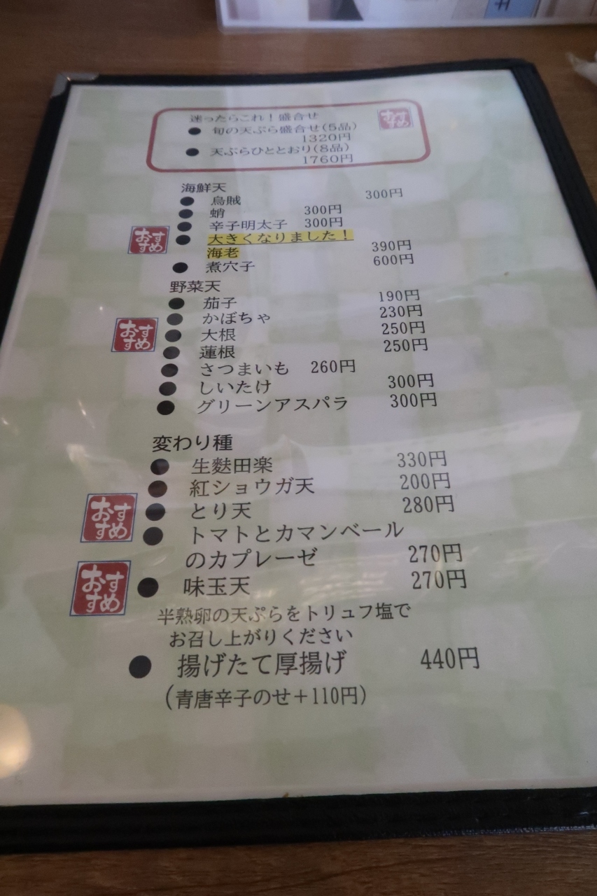 天ぷら、天丼とも具材は同じようで、海老1本、キス、茄子、ししとう、南瓜、人参。カラリと揚がっており普通に美味しい。セットの天丼ご飯はかなり上品な盛りなのでよく食べる方は大盛にした方が良さそうです。