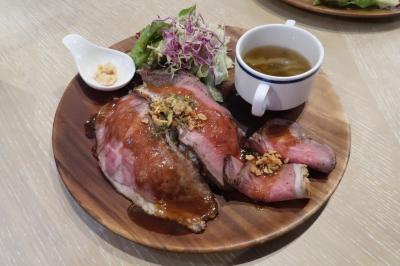 ●SHIMANONE特製ローストビーフ丼 大きなローストビーフは火の通し加減も良く、しっとりやわらか。掛けられたグレイビーソース(?)が肉の旨味を引き立て、添えられたホースラディッシュが味を引き締めます。下には温泉卵とご飯。合わせる事で味変も楽しめ、美味しかったです。