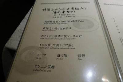 週末、美術展鑑賞後のランチ。久しぶりにフカヒレを食べようとこちらへ。11時35分着ですぐ入店。半個室になったテーブル席に案内されました。当初はふかひれつゆそばを注文するつもりでしたが、メニューを見ているうちに気持ちが変わり「特製ふかひれ姿煮込みと海の幸セット」を注文。ただ少し野菜が足りないように思い、黄ニラともやしの炒めも追加。