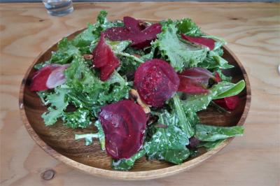 ●サラダ(共通メニュー) ケール、ルッコラ、ビーツのサラダ。チーズのドレッシングがよく絡み程よい苦みが美味しい。