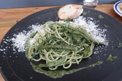 四万温泉旅行のランチで訪問。早めに11時半に到着。前日は並んでいましたが、今日はすぐ入店できました。店内はカウンターを含めほとんどDIYで作られたそうで、手作り感満載です。注文したのはパスタ or ピッツァを選べる週替わりパスタセット@1500円(税別)。選んだのは館林産インゲンとペコリーノ、フレッシュバジルのジェノベーゼ(+200円)とマルゲリータ。相方が泡が飲みたいというので追加。