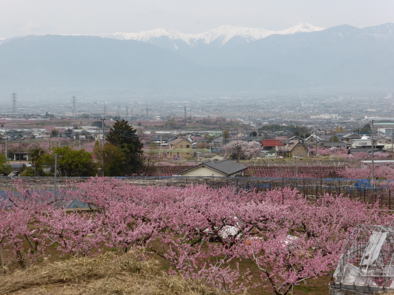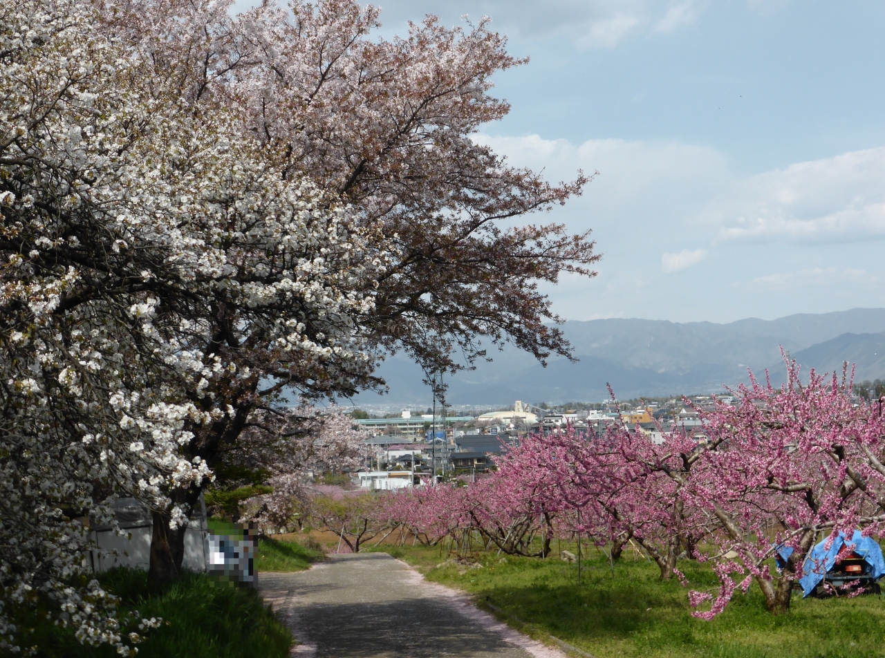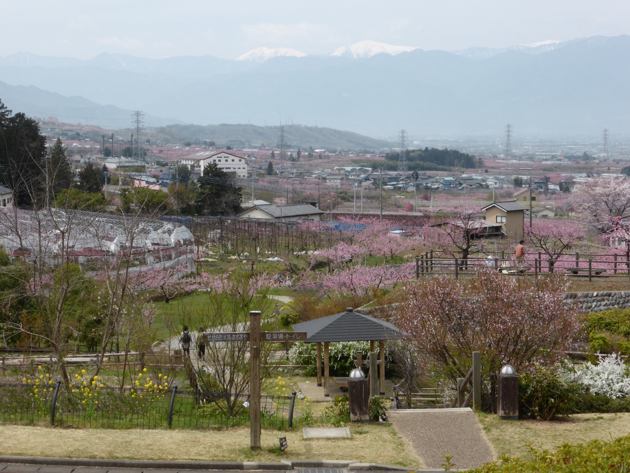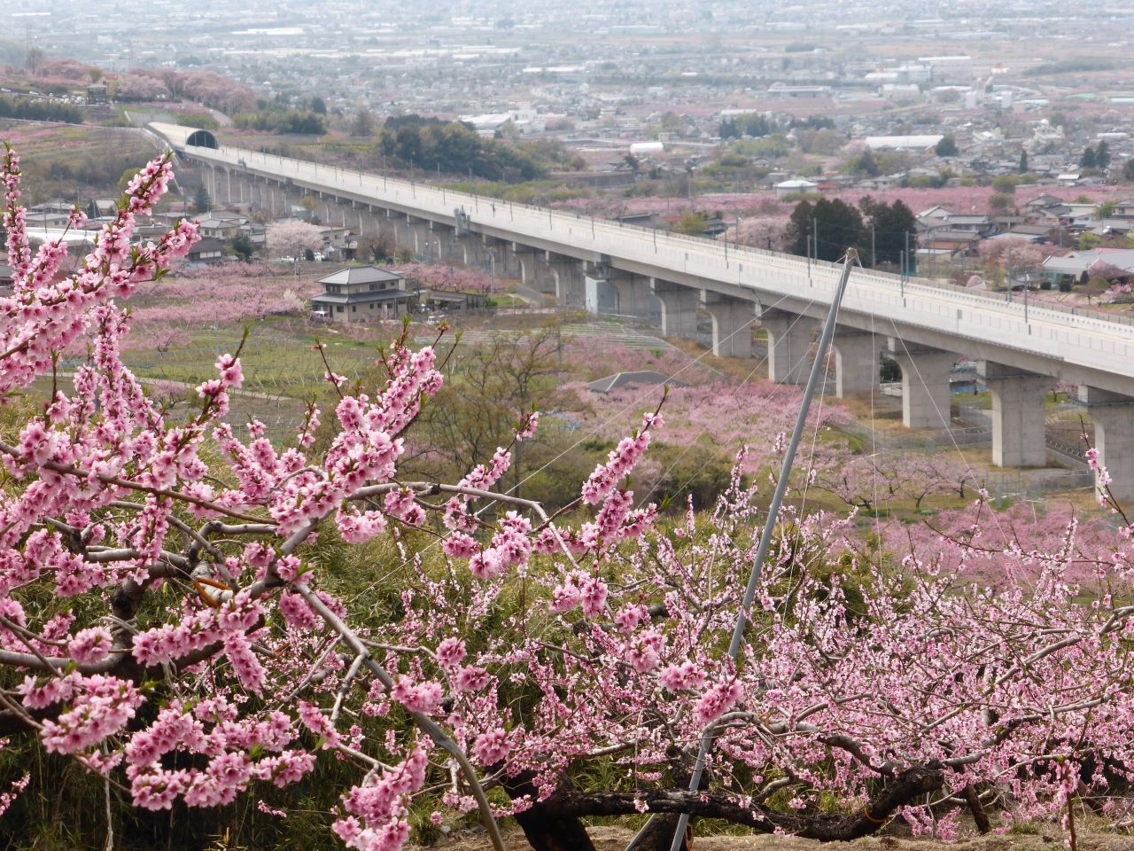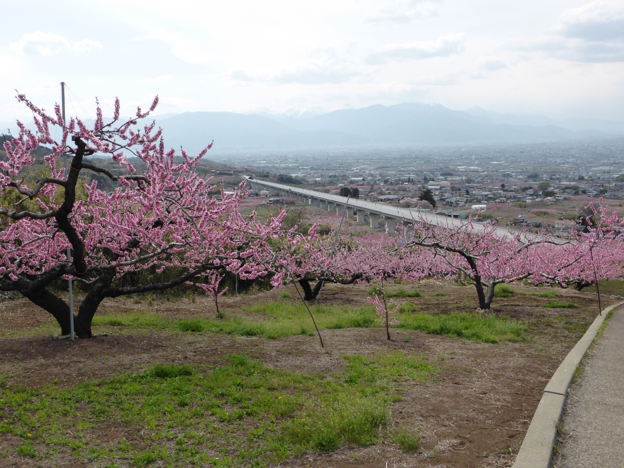 花鳥山は縄文時代の集落遺跡です。(看板にも花鳥山遺跡とあります。)しかし現在は笛吹市の桜の名所として有名です。駐車場はありますがさほど広くないので、この時期は混雑します。シンボルとも言うべき一本杉が真ん中に鎮座し、周りの桜は枝ぶりも立派で見ごたえがありました。駐車場からの展望も良く、標高が高い場所にあるので、桜と同じ時期に咲く桃の花が楽しめます。桃畑の奥にはリニアの実験線も見え、これから増々人気の観光スポットになるのではないでしょうか。