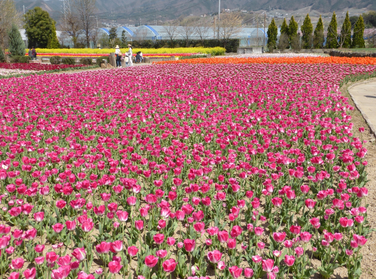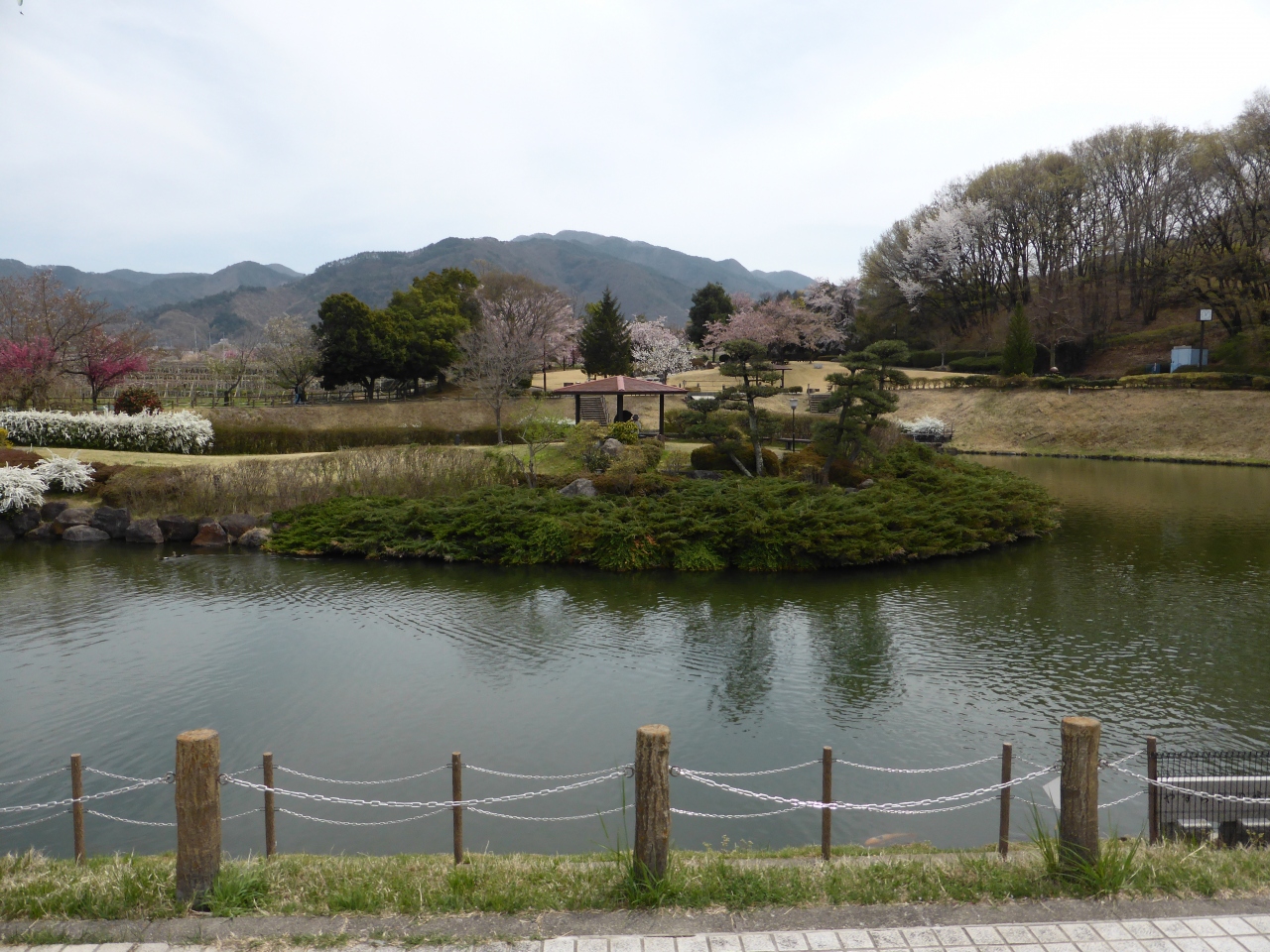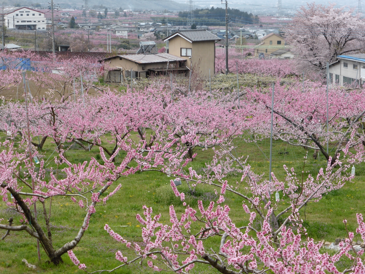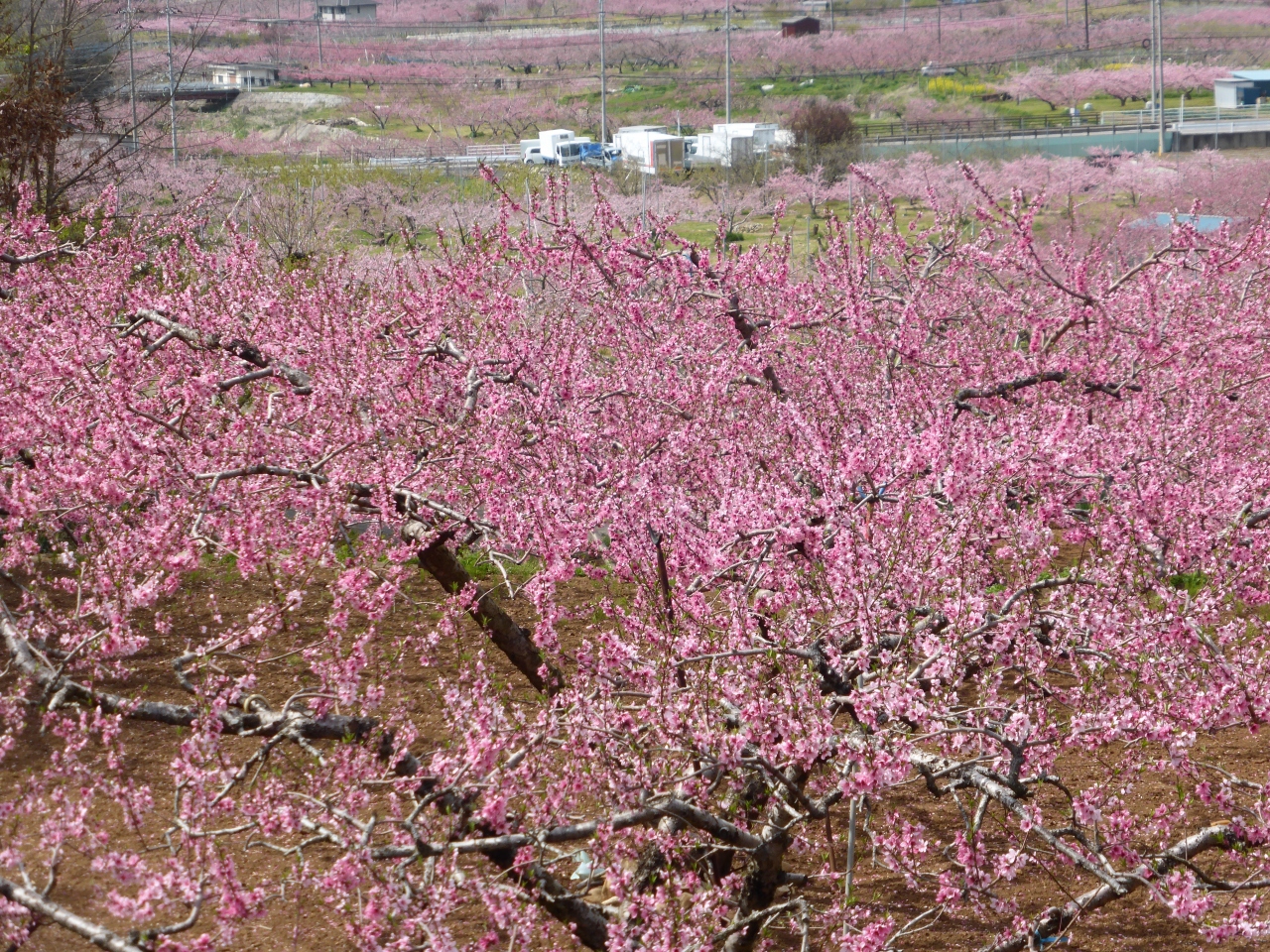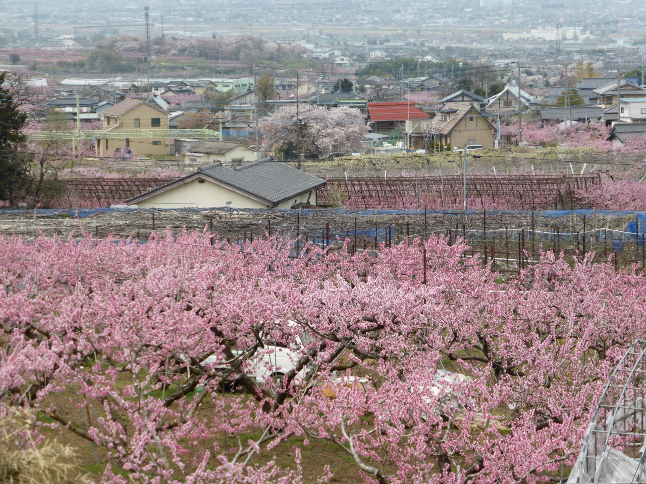 花鳥山は縄文時代の集落遺跡です。(看板にも花鳥山遺跡とあります。)しかし現在は笛吹市の桜の名所として有名です。駐車場はありますがさほど広くないので、この時期は混雑します。シンボルとも言うべき一本杉が真ん中に鎮座し、周りの桜は枝ぶりも立派で見ごたえがありました。駐車場からの展望も良く、標高が高い場所にあるので、桜と同じ時期に咲く桃の花が楽しめます。桃畑の奥にはリニアの実験線も見え、これから増々人気の観光スポットになるのではないでしょうか。