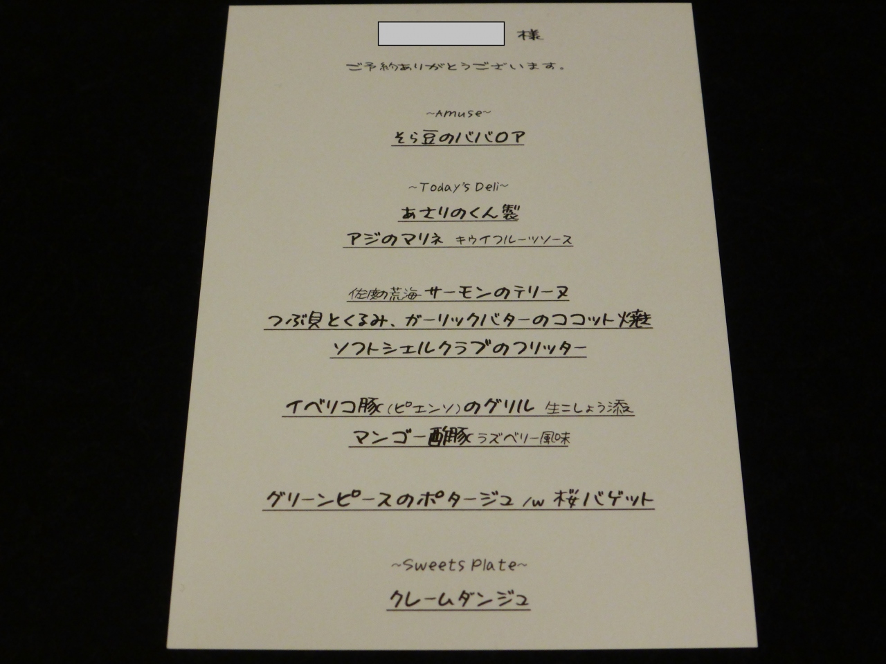アミューズのそら豆のババロアは豆の風味が残り、一気に春を感じさせます。本日のデリは今が旬のあさりの燻製。かなり大粒で香りも良く旨みも十分。テリーヌはサーモンと帆立。ねっとりとしたコクのある旨さに人参とおくらの食感も楽しい一品。ソフトシェルも軽やかな揚げあがりで香ばしい。イベリコ豚は生コショーがいいアクセント。マンゴー酢豚は甘酸っぱいソースと豚肉との相性は抜群です。ポタージュのグリーンピースはやさしい味付け。青っぽい豆の風味も残り春ならではの味わいです。デザートのクレームダンジュはふわふわとしており、チーズ風味のメレンゲか綿菓子を食べているような食感で新鮮なおいしさ。お腹も十分一杯になり大満足です。