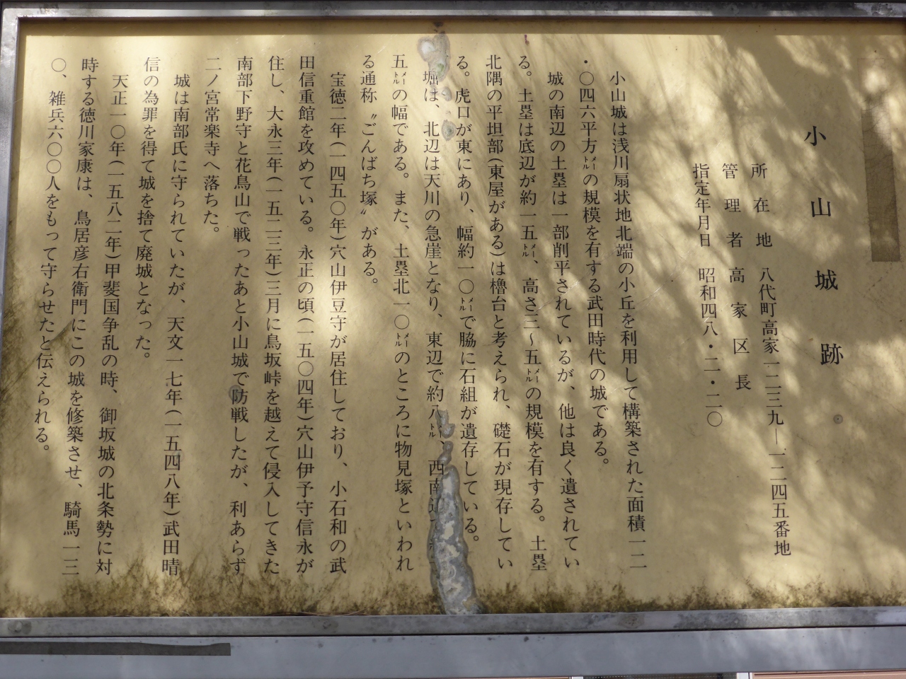 武田時代に作られたお城址です。花鳥山の向かう途中、ナビに小山城址と表示されたので立ち寄ってみました。(ふえふき旬感ネットの開花情報で写真が上がっていたので、何となく見覚えがありました。)