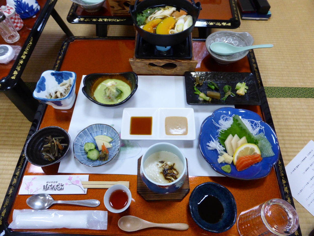 夕食は1階の大広間で18時から。当日の献立は、山菜、あかね鱒燻製、ほうとう鍋、手打ちそば、山女の塩焼きなど。山梨県産の滋味深い料理が並びます。特に焼きたてで頂く山女の塩焼きは絶品でした。ご飯は少々炊き上がりに不満がありますが、全体としては満足です。(朝食は早朝出発のためお握りに変更。)