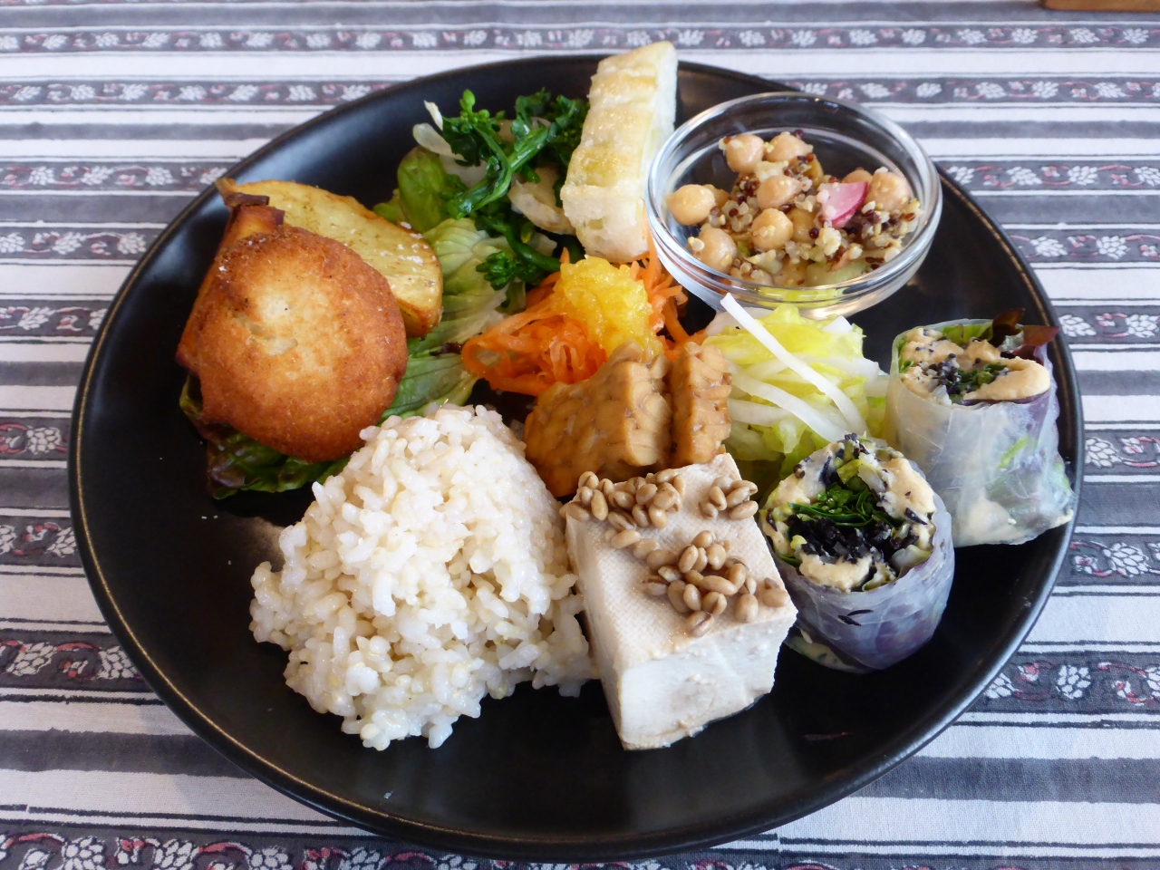 山梨旅行の際に訪問。穴山駅から少し入った所にお店はあります。小さいですが看板が角々にあり迷わず到着できました。店内はカウンターとテーブル席が二つ。テラス席もあります。注文したのはベジプレートとレンズ豆と野菜のカレー。共にスープと飲み物が付きます。